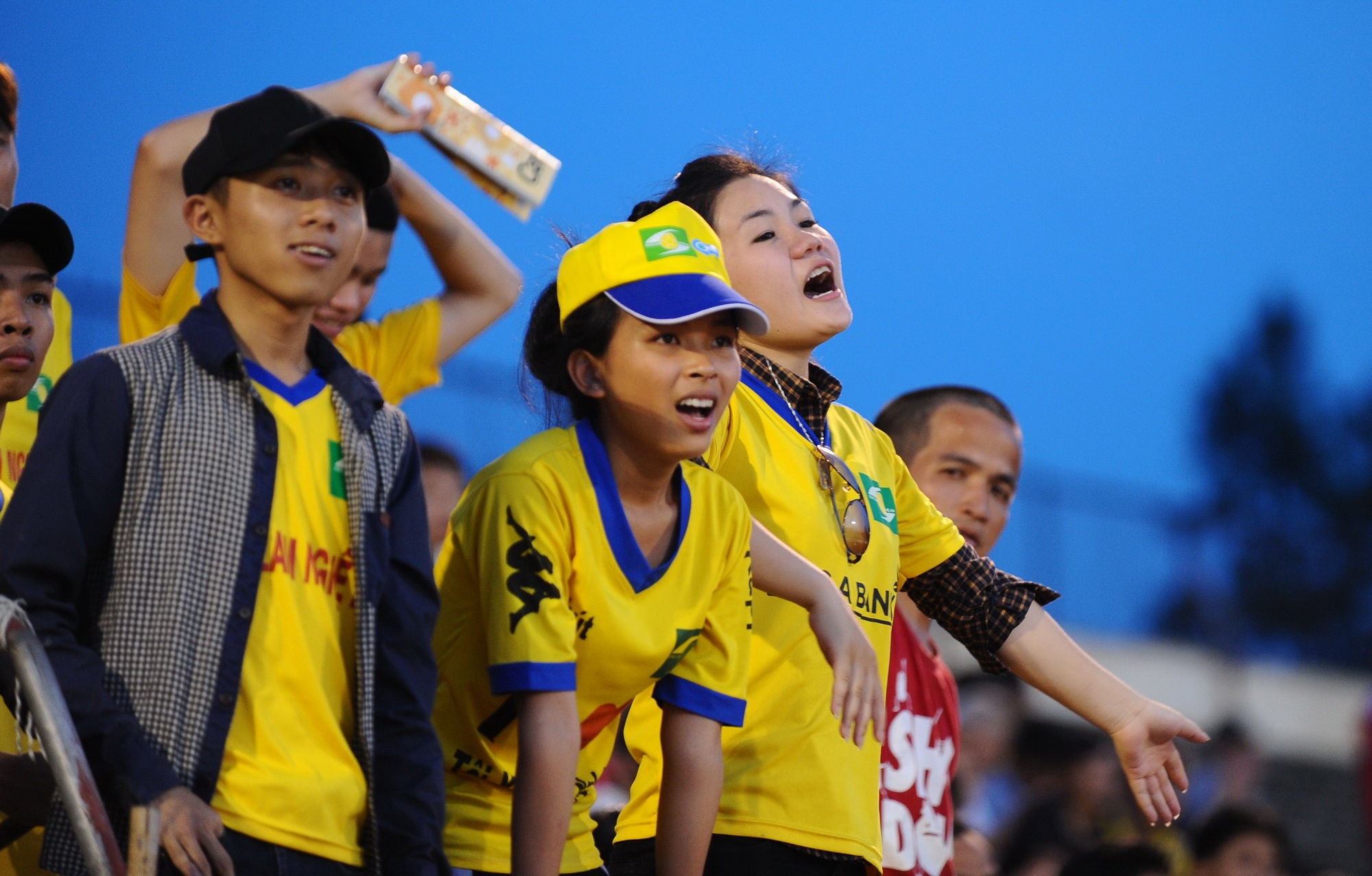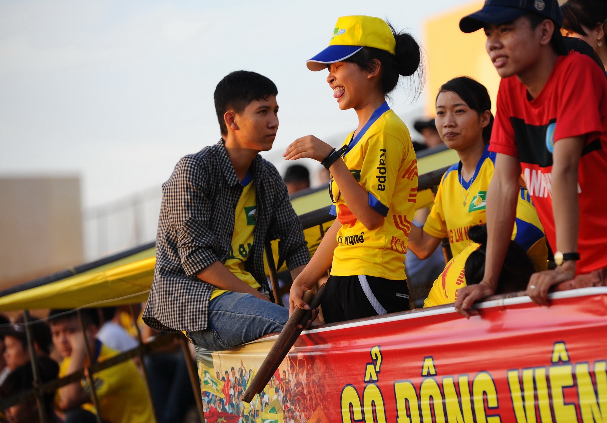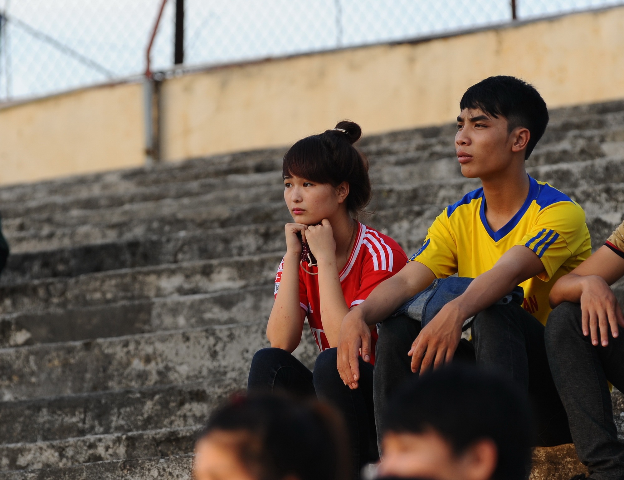 | CĐV nữ mặc áo đỏ cổ động B. Bình Dương ngồi cạnh bạn trai là fan SLNA. |