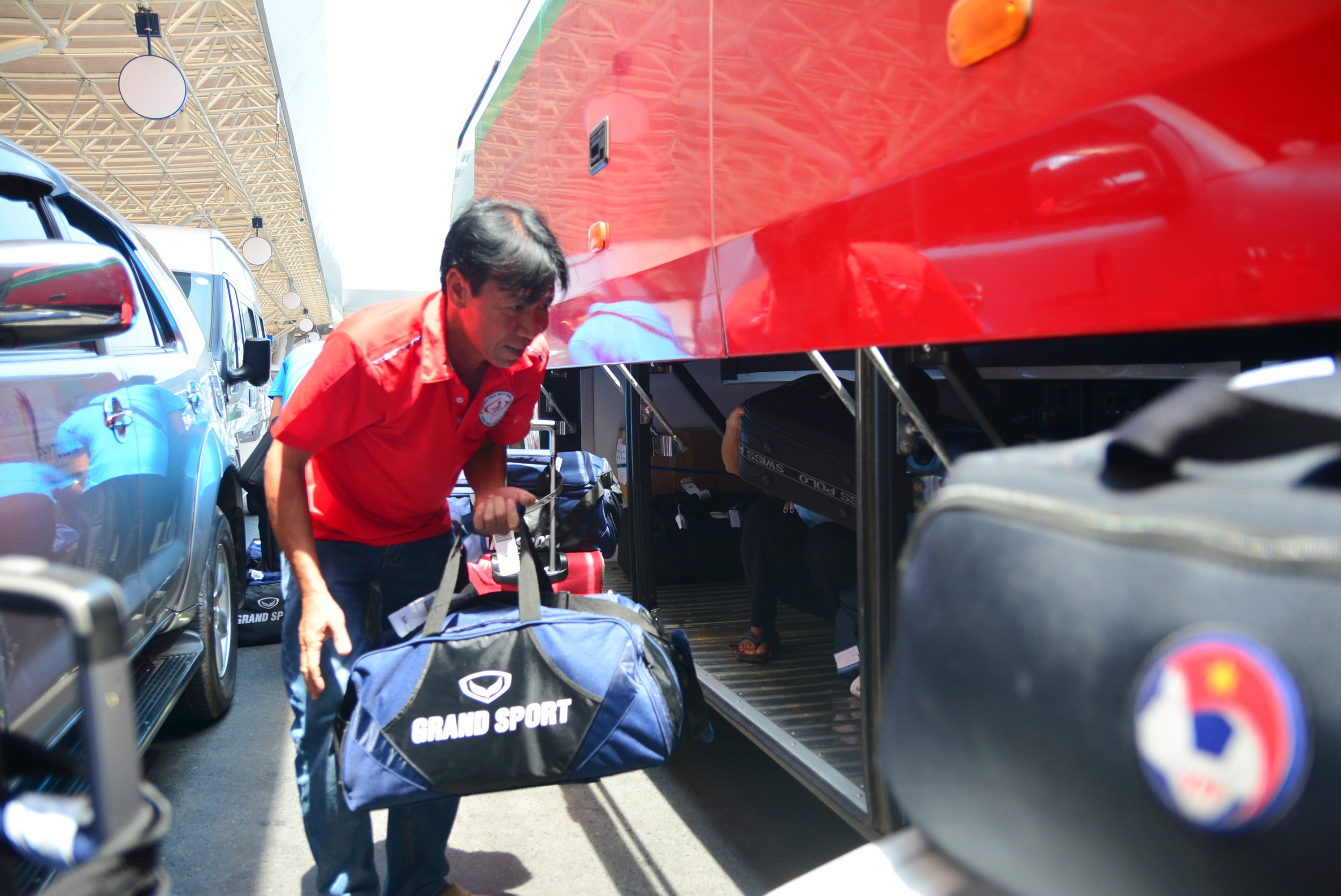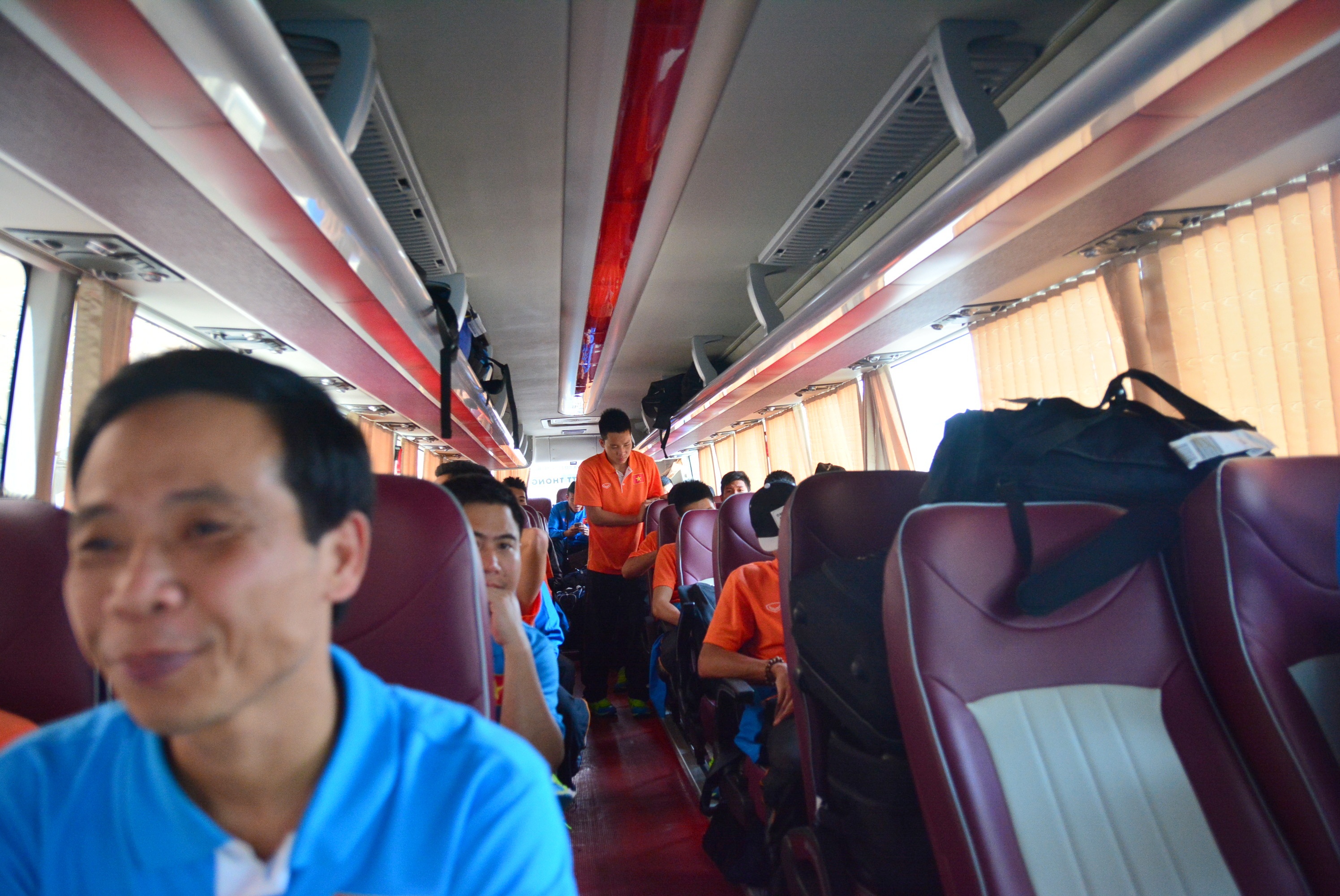 | Trung tâm TDTT Thống Nhất bố trí một xe 45 chỗ để đưa đón đội. Do hành lý nhiều, các thành viên ban huấn luyện mất hơn 15 phút mới sắp xếp ngăn nắp trước khi di chuyển. |