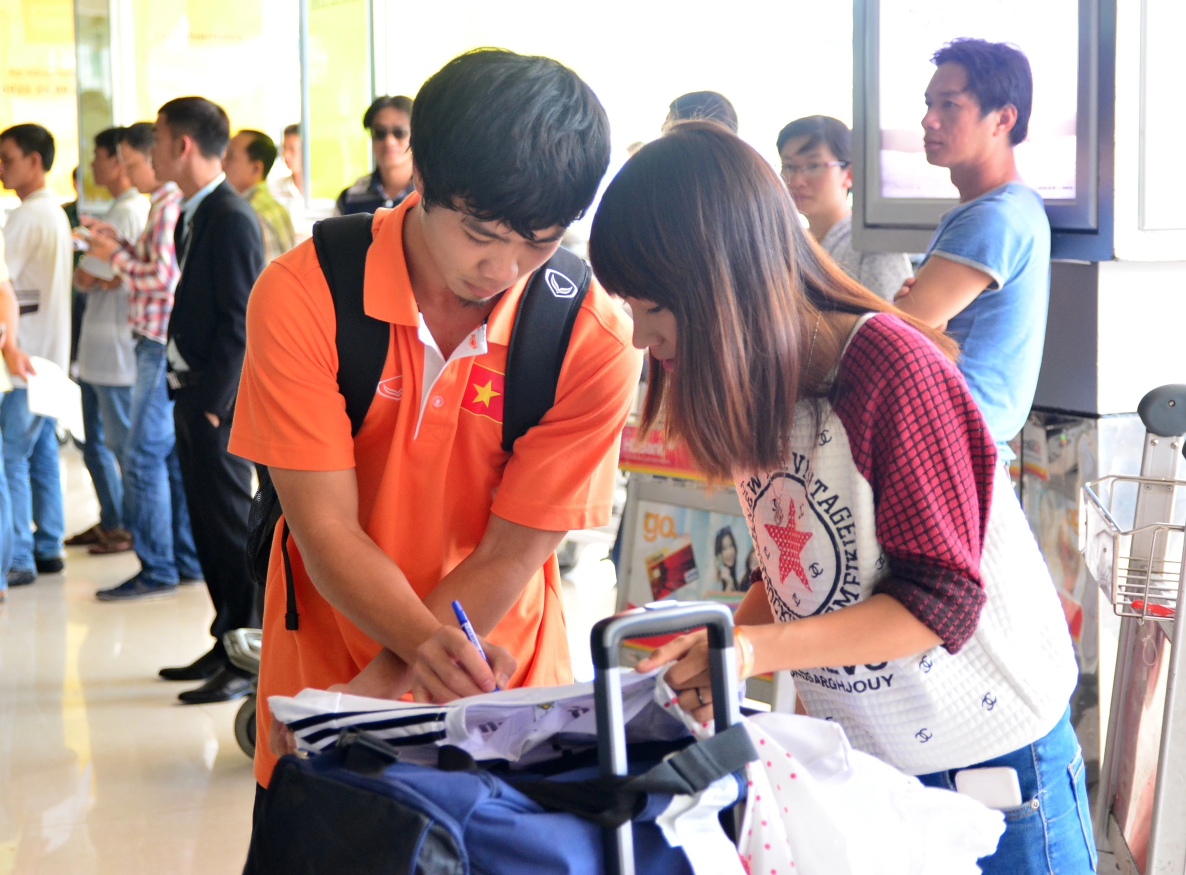 Fan nữ xin chữ ký Công Phượng tại sân bay