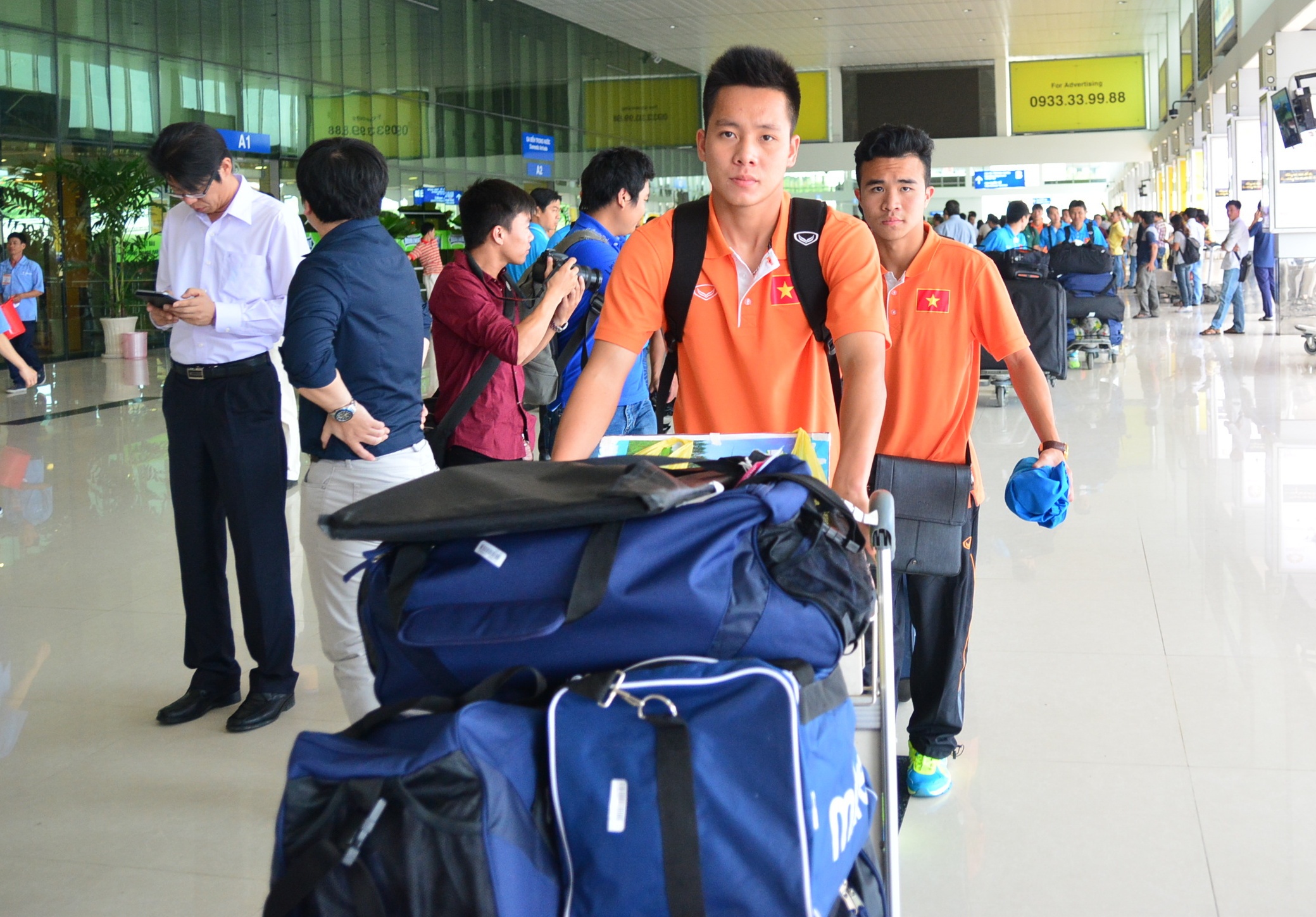 | Các cầu thủ tập kết ra xe để về nơi nghỉ ngơi. Đội được VFF bố trí ở tại khách sạn Đệ Nhất. Ngoài hành lý riêng của các cầu thủ, ban huấn luyện Olympic Việt Nam cũng mang rất nhiều dụng cụ tập luyện. |