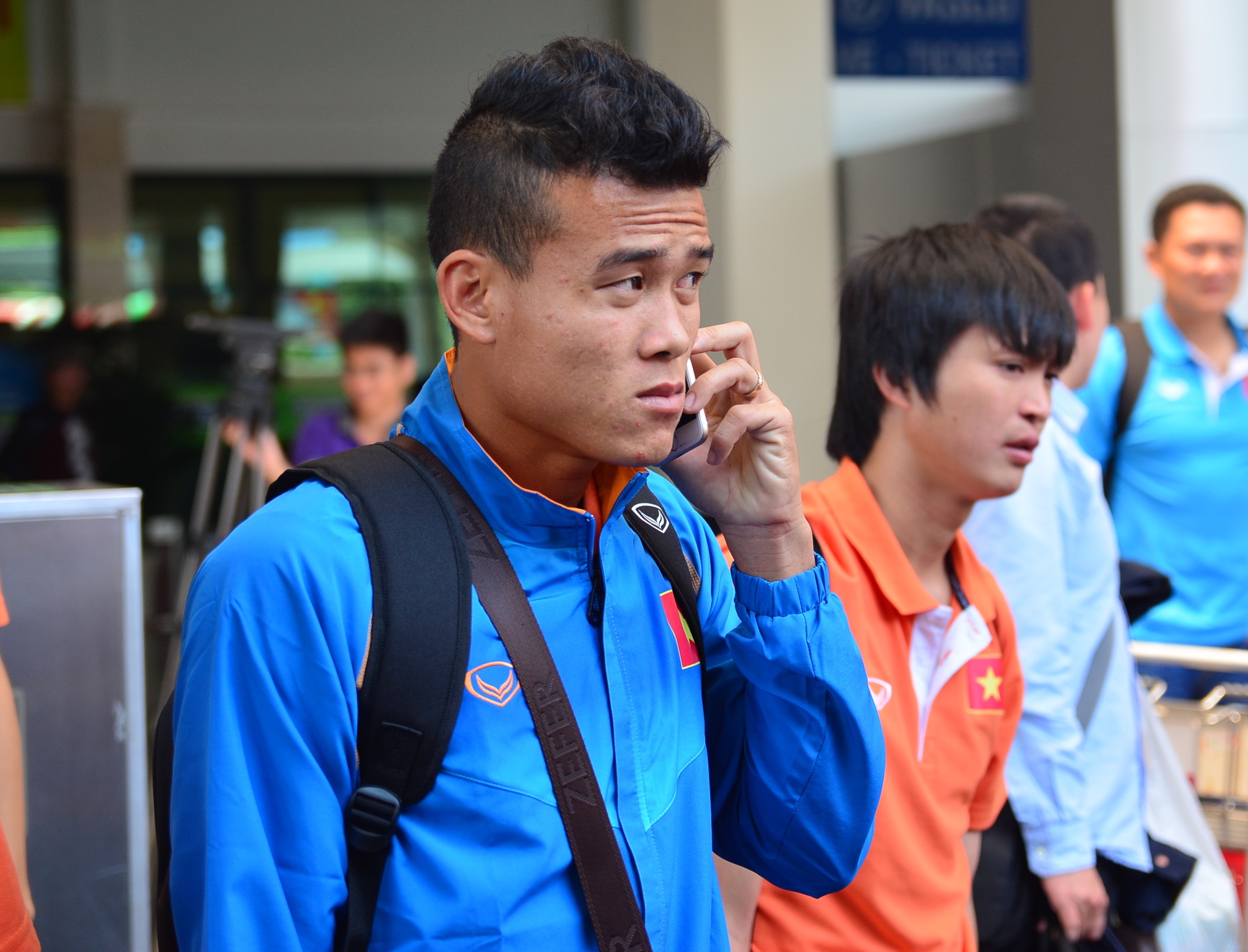| Hậu vệ Nguyễn Thanh Hiền tranh thủ gọi điện cho người thân. Anh vừa được HLV Miura sử dụng với vai trò hậu vệ lẫn tiền vệ trong trận thắng Olympic Indonesia 1-0. |