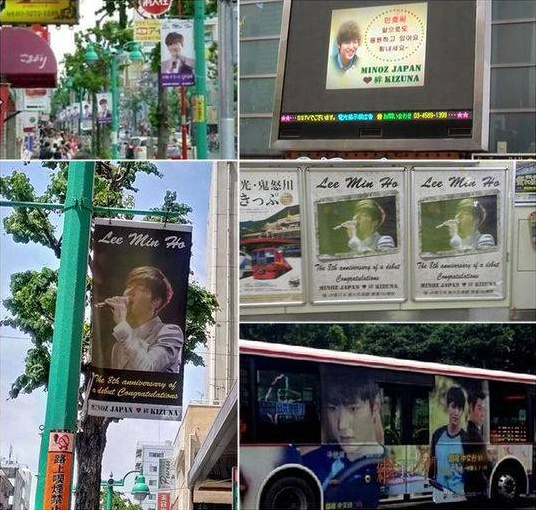 Gương mặt điển trai của Lee Min Ho xuất hiện từ cột đèn đường, biển quảng cáo cho tới xe buýt. Kizuna in trên các poster và cờ hiệu này những dòng chữ nổi bật như: "8 năm ngày ra mắt. Chúc mừng anh!", "Min Ho sshi, Kizuna sẽ luôn bên bạn. Hãy luôn mạnh mẽ nhé!".