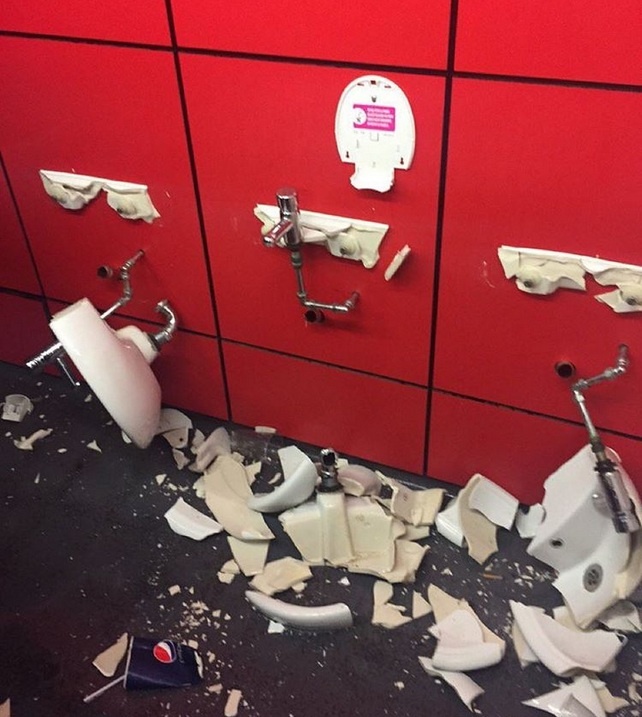 | Hình ảnh đổ nát ở khu vệ sinh tại Emirates được chia sẻ rộng rãi trên các mạng xã hội. Ảnh: Instagram. |