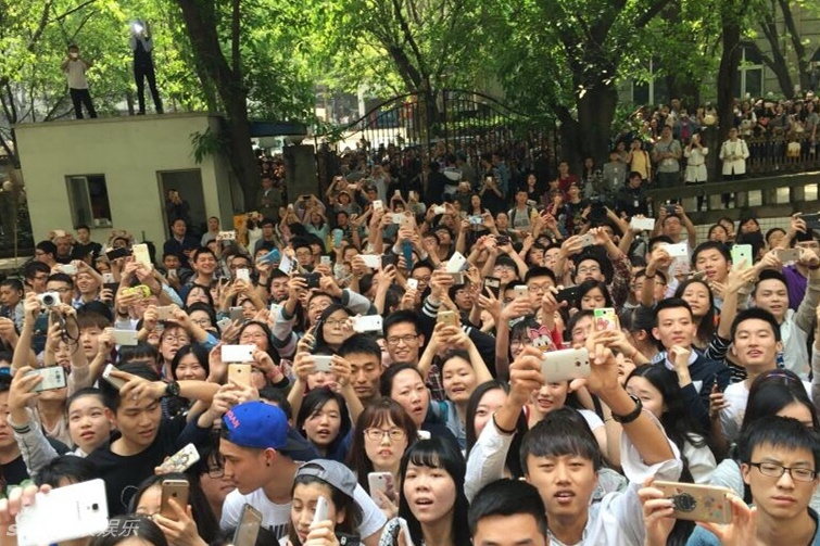 | Sự xuất hiện của cặp đôi nổi tiếng khiến lực lượng bảo vệ phải vất vả. Hàng nghìn sinh viên chen chúc với những chiếc điện thoại sẵn sàng chụp ảnh để ghi lại khoảnh khắc gặp thần tượng. |