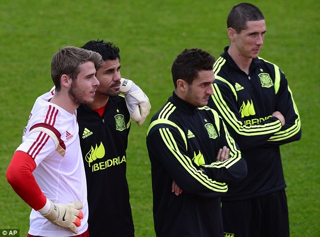 | David De Gea (trái) và Fernando Torres (phải) từng khoác áo CLB Atletico Madrid. Trong khi đó, Diego Costa và Koke là 2 nhân tố quan trọng giúp CLB chủ sân Vicente Calderon đoạt danh hiệu ở La Liga mùa vừa qua. Màn trình diễn rất tốt trong màu áo Atletico giúp họ được triệu tập vào ĐT Tây Ban Nha. |