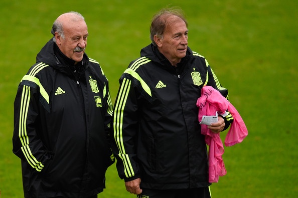 | HLV Del Bosque và trợ lí Toni Grande có nhiệm vụ giúp tuyển Tây Ban Nha lần thứ 2 liên tiếp vô địch World Cup. |