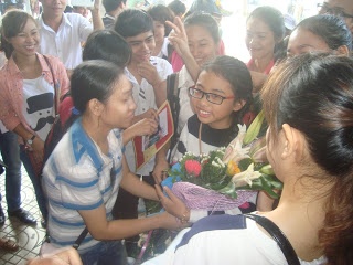 Vừa có mặt tại sân bay Tân Sơn Nhất, chị Bảy đã được FC Hà Nội vây kín với hoa, quà tặng và rất nhiều câu hỏi.