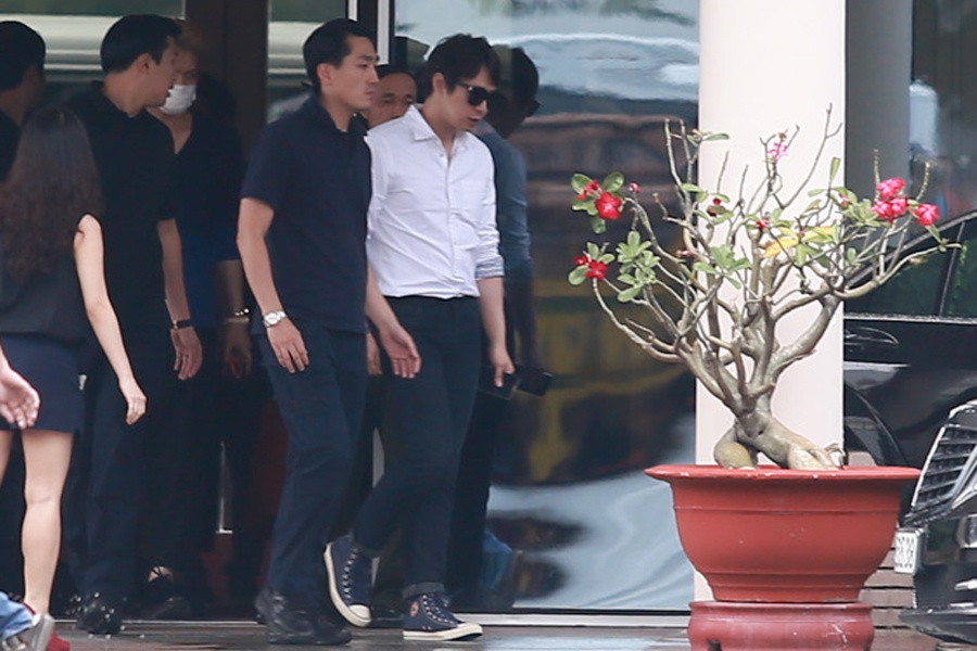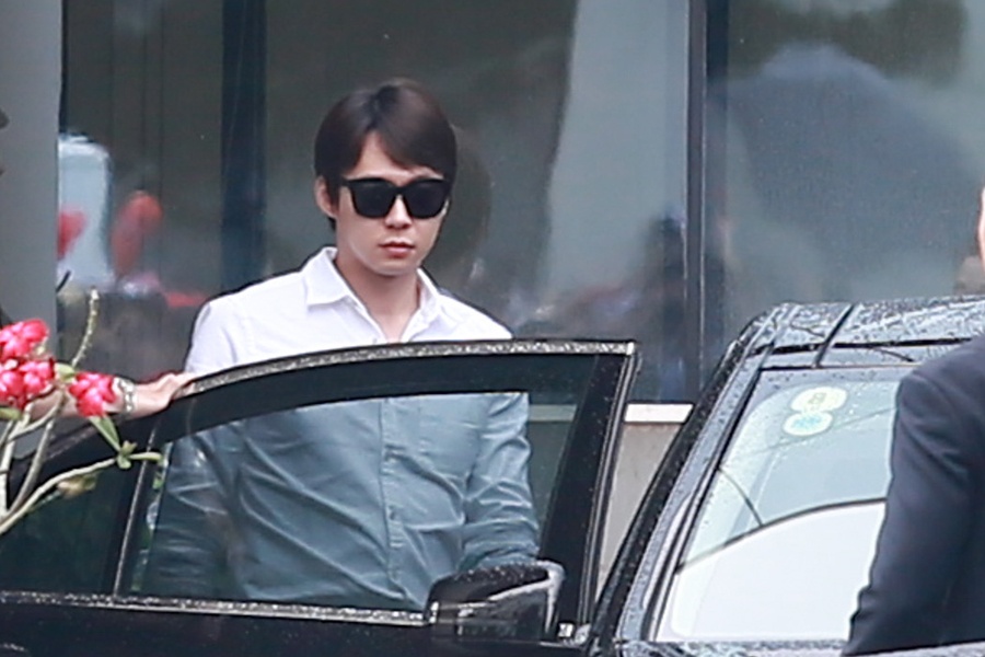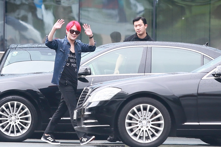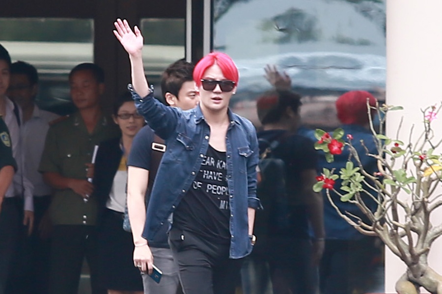 | Ngay khi bước ra khỏi sảnh chờ, dù đeo bịt mặt nhưng Jaejoong vẫn vẫy tay chào các fan đang đứng chờ đợi nhóm ở khu vực cổng ra vào. |