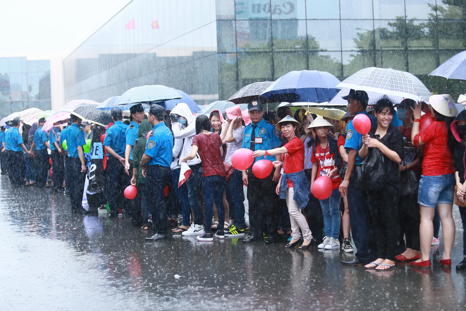Sáng 29/8, đông đảo fan đã hội tụ về sân bay Tân Sơn Nhất để chào đón JYJ sang Việt Nam. Cơn mưa bất chợt khiến nhiều fan ướt nhẹp. |