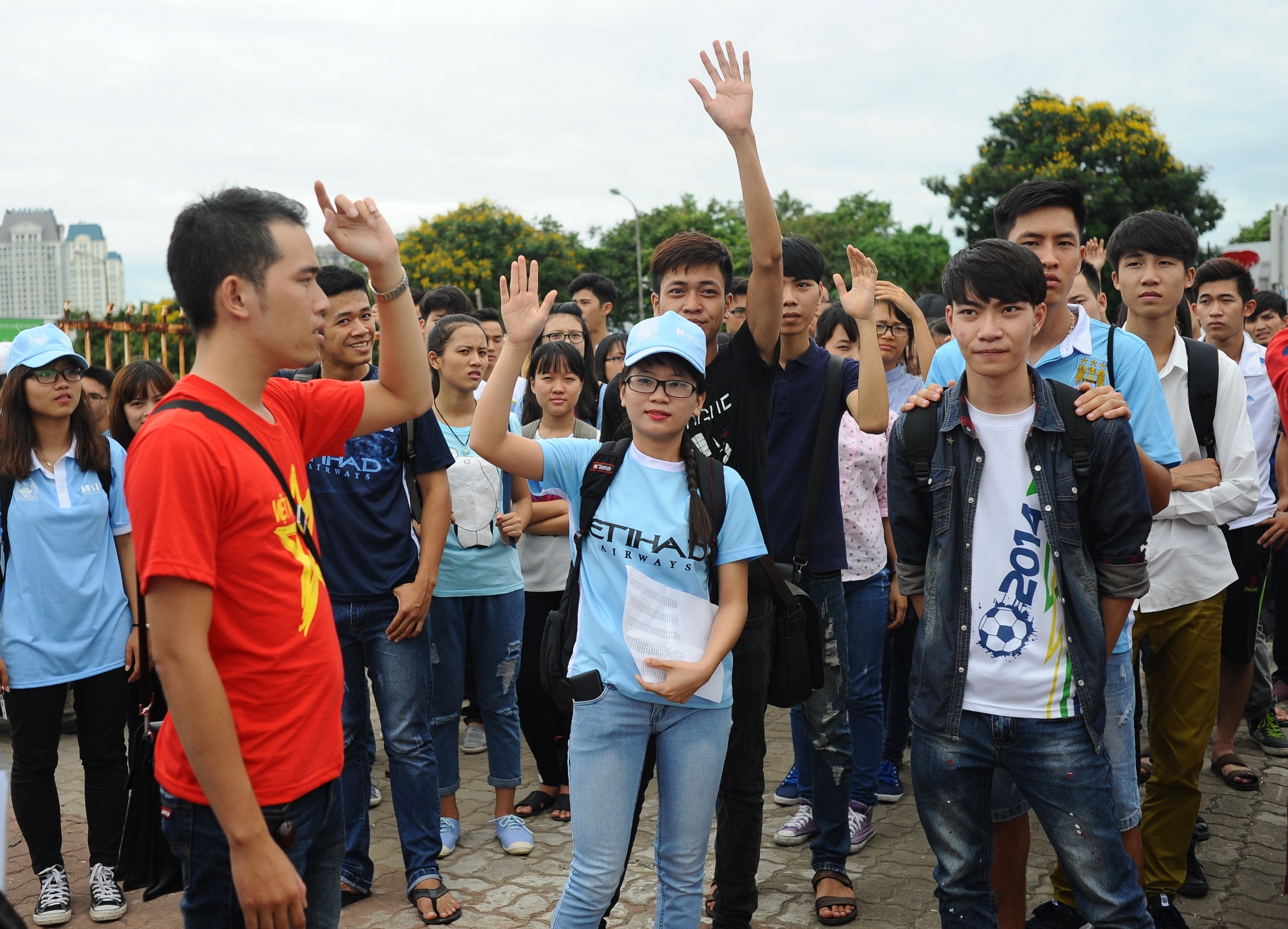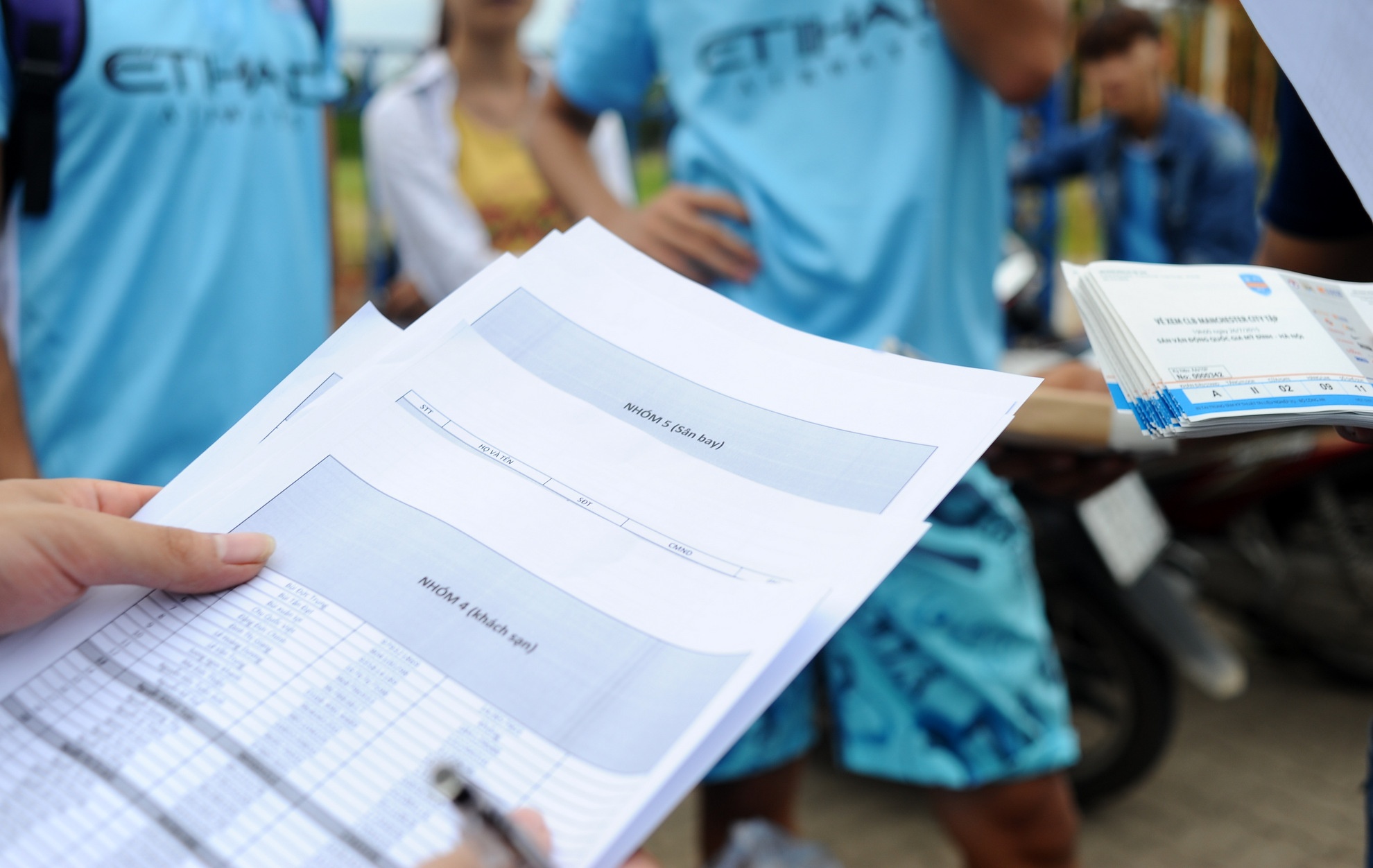| Bạn N.K.Toàn cùng đội bóng của mình mang theo chứng minh thư để được nhận vé xem buổi tập miễn phí của thầy trò HLV Pellegrini |