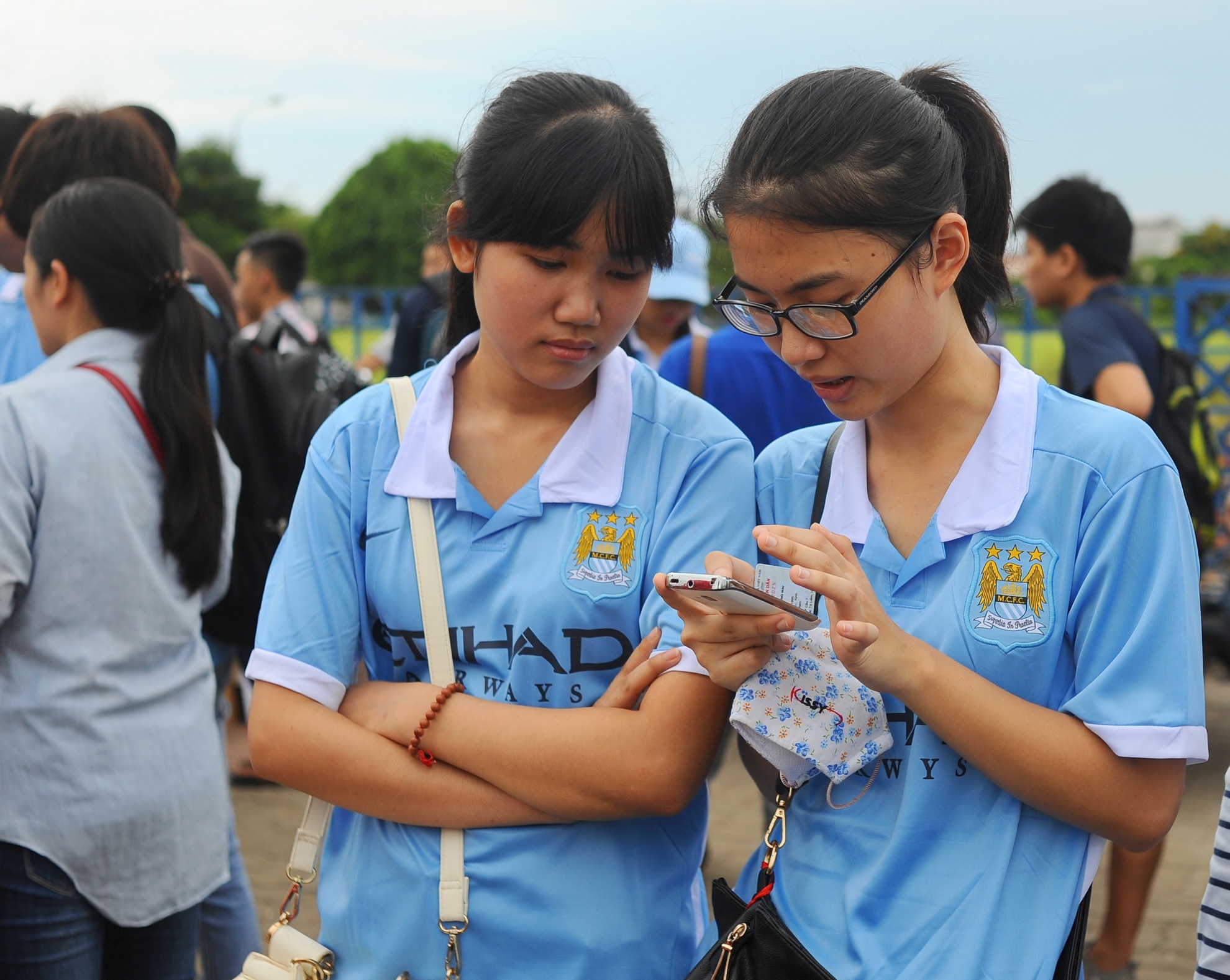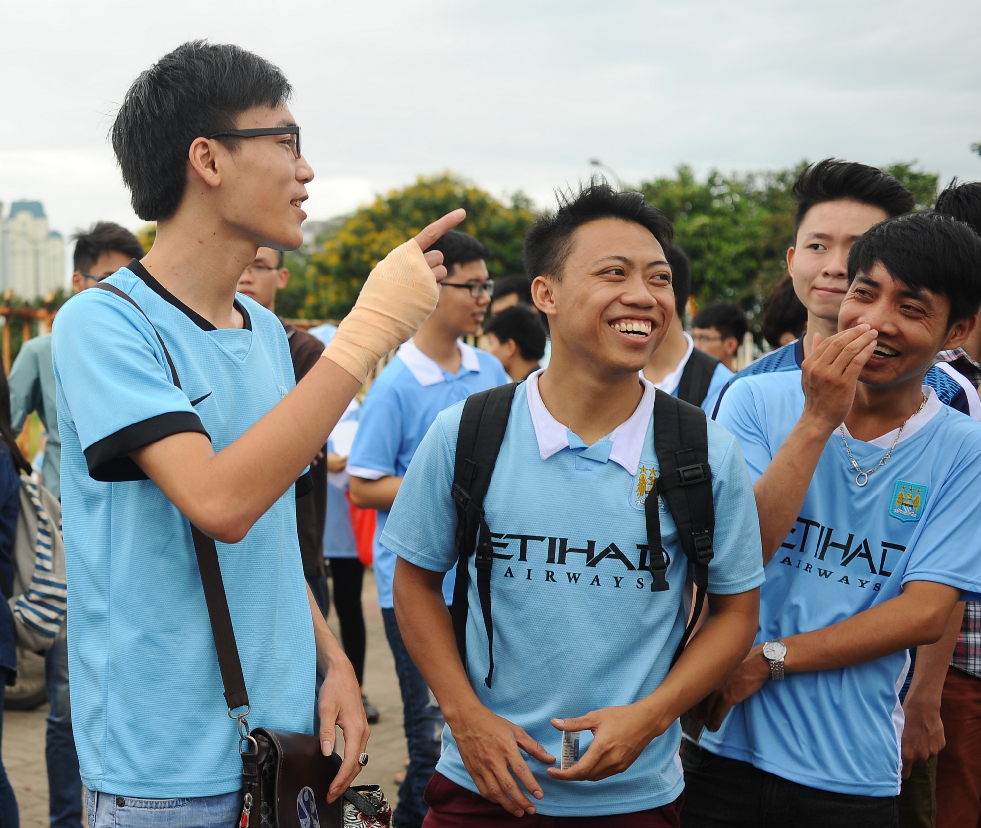 | Nửa ngày trước khi Man City đặt chân tới Việt Nam, CĐV Man City phía Bắc tụ hội trước cửa SVĐ Mỹ Đình để lên kế hoạch cổ vũ, chào đón thầy trò HLV Pellegrini lúc 18h30 tối nay, tại sân bay Nội Bài. Trong số hàng nghìn người hâm mộ "Man xanh" tại Việt Nam, có những trường hợp đặc biệt khi phải thuyết phục "nửa kia" của mình là fan của đội bóng đối thủ như M.U, Arsenal... |
