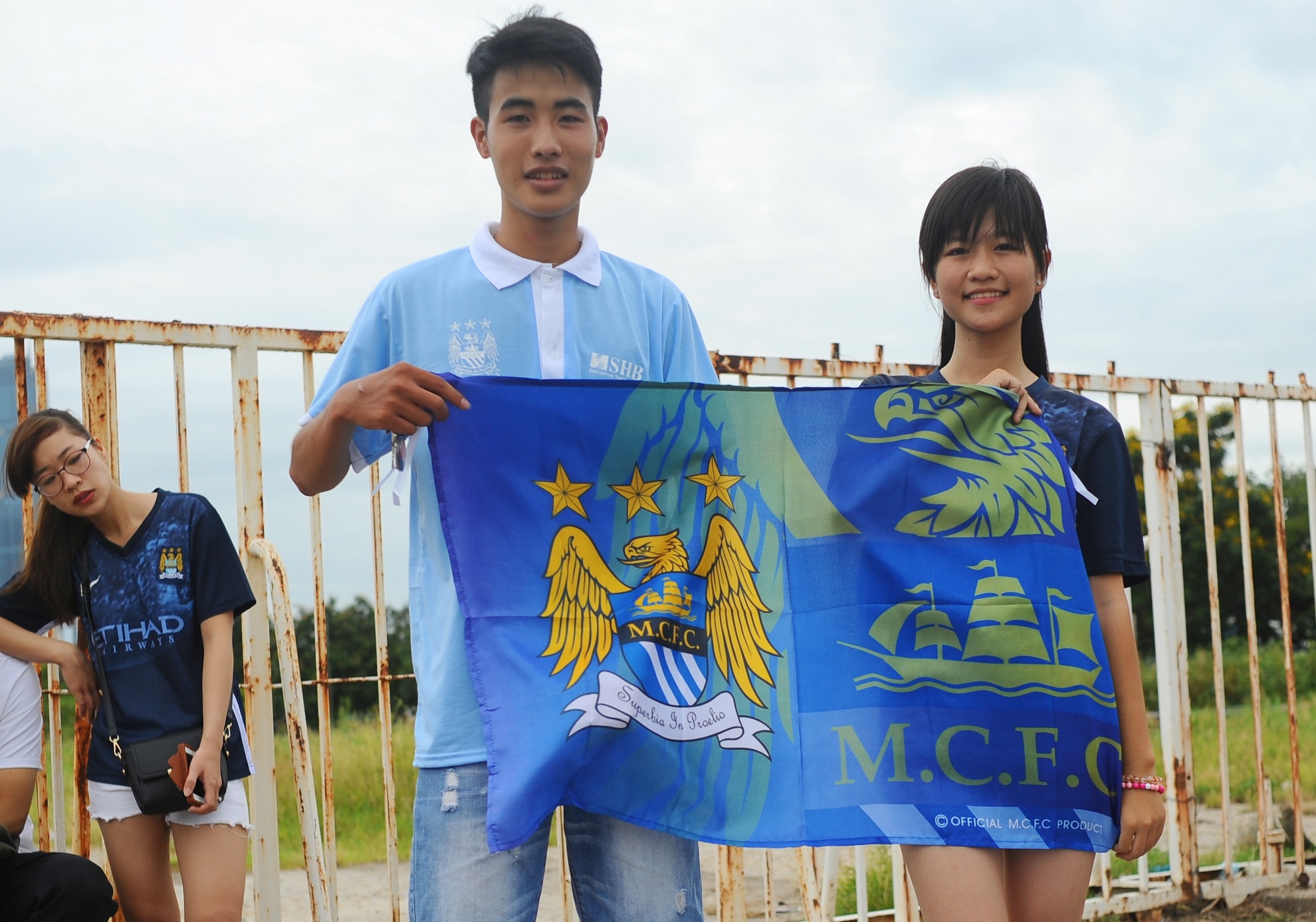 | Các bạn trẻ háo hức chụp ảnh cùng lá cờ chính thức của Hội CĐV Man City toàn cầu. |