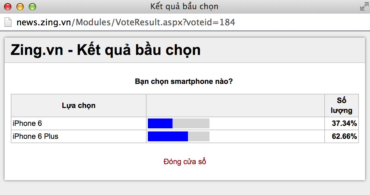 Khảo sát trên Zing.vn cho thấy gần 63% độc giả thích iPhone 6 Plus và 37% thích iPhone 6. Kết quả này không nằm ngoài dự đoán khi từ lâu đã có một bộ phận người dùng Android mong muốn chuyển sang iOS khi Apple ra mắt chiếc iPhone có màn hình lớn. Tỷ lệ 6:4 của iPhone 6 Plus và 6 cũng không quá áp đảo, cho thấy những tín đồ trung thành của Apple vẫn không muốn sở hữu một chiếc iPhone 6 có kích thước quá to.