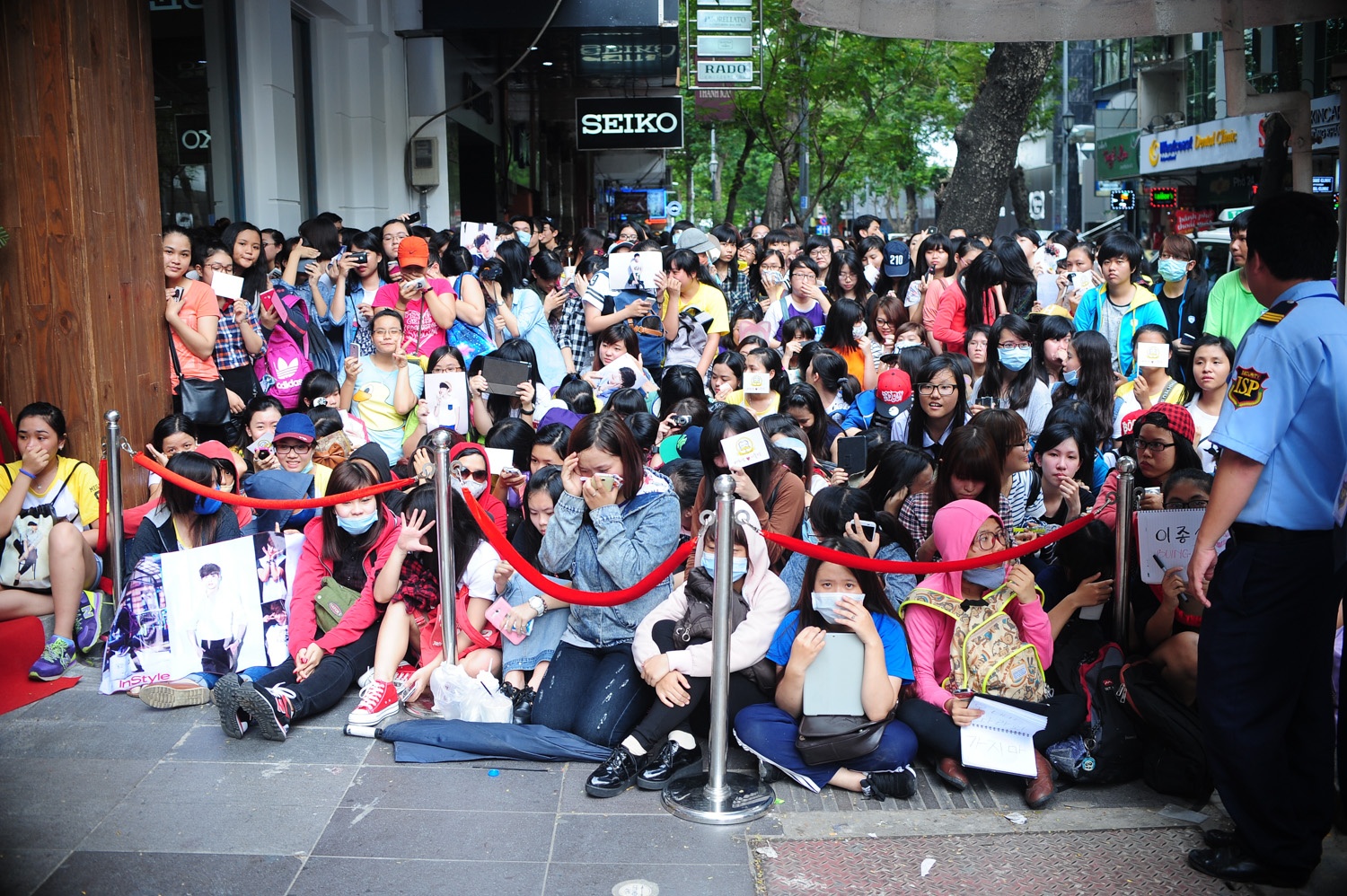 | Trước đó 2 tiếng đồng hồ, khu vực đường Đồng Khởi bị tắc nghẽn bởi 4 mặt đường fan đứng chật cứng để chờ thần tượng. Theo ban tổ chức, có khoảng 50.000 fan đăng ký online tham gia buổi ký tặng của Lee Jong Suk. Các bạn trẻ đội nắng đứng và ngồi bệt trước khu vực quán cà phê để chờ anh. Họ không ngừng hò hét, hô tên và giơ cao cờ, poster có in hình rất ngộ nghĩnh của thần tượng. Khi mỹ nam xuất hiện, fan chen lấn, phá hàng rào để tiến lại gần nam diễn viên khiến các vệ sĩ khó khăn để ngăn cản. |