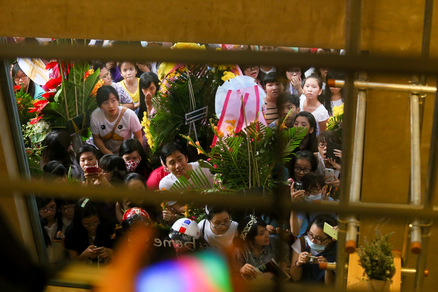 | Fan đứng áp sát cửa kính của quán cà phê để được ngắm nhìn mỹ nam. |