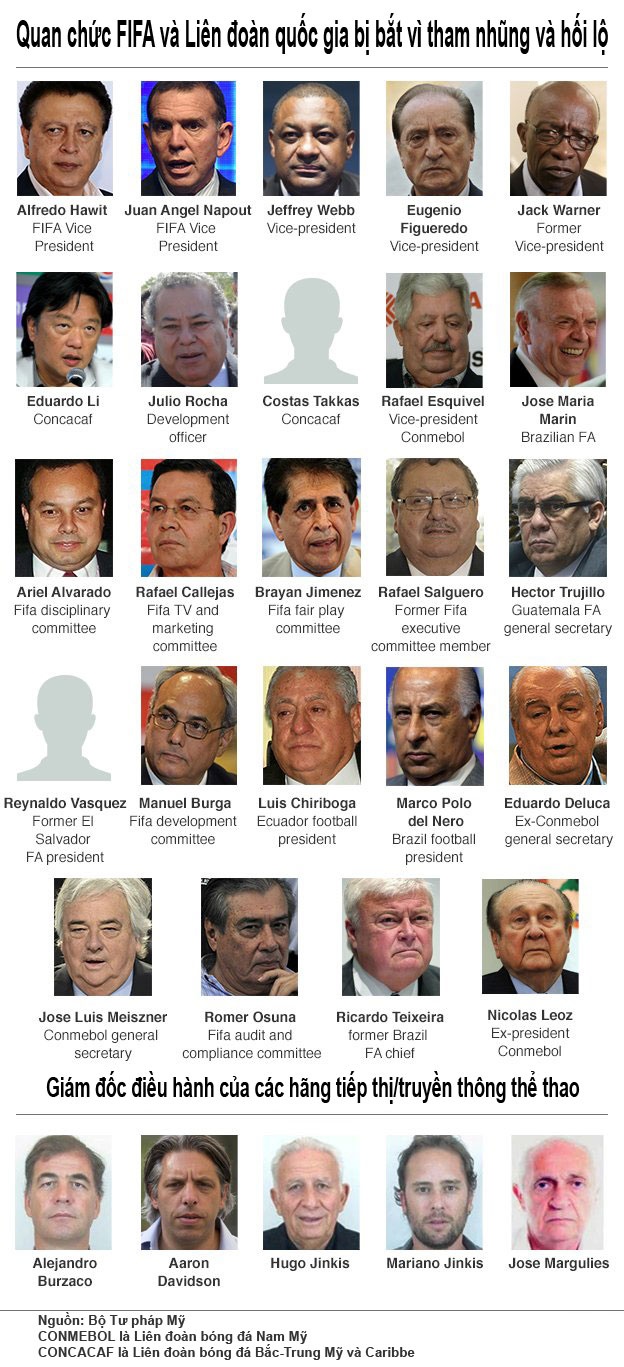Ngày 3/12 vừa qua, cảnh sát Thụy Sỹ đột kích khách sạn sang trọng Baur au Lac ở thành phố Zurich và bắt giữ hai Phó chủ tịch FIFA, Alfredo Hawit và Juan Angel Napout. Từ hai mắt xích này, cơ quan điều tra bắt thêm 14 nghi phạm đều là thành viên của cơ quan bóng đá quyền lực nhất thế giới.