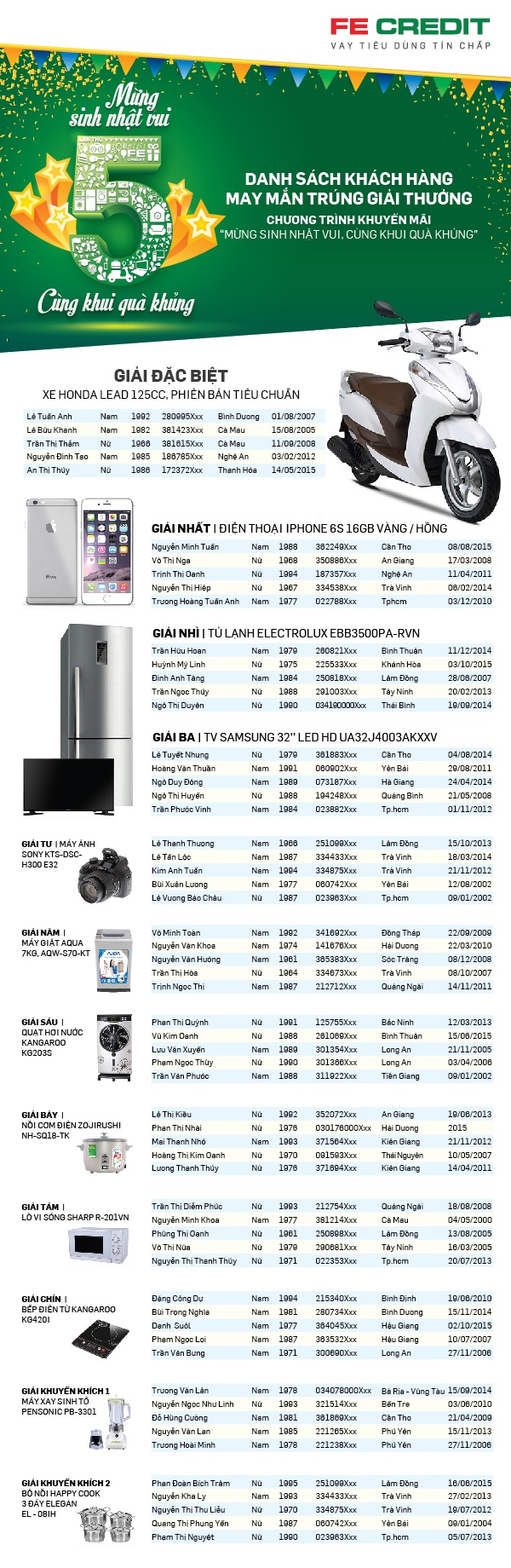 FE Credit chúc mừng 60 khách hàng sau đã may mắn trúng các giải thưởng hấp dẫn của chương trình với tổng giá trị giải thưởng lên đến gần 500 triệu đồng.