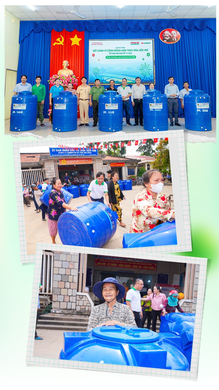Ở khía cạnh môi trường, FE Credit tập trung vào những vấn đề mang tính dài hạn của khu vực Đồng bằng sông Cửu Long, đặc biệt là tình trạng hạn hán và xâm nhập mặn. Từ đầu năm 2025, doanh nghiệp triển khai chuỗi hoạt động trao tặng hàng trăm bồn chứa nước cho người dân tại Bến Tre (cũ) và Long An (cũ). Tại các địa phương như xã Phước Vĩnh Đông (huyện Cần Giuộc, Long An cũ), những bồn chứa nước được trao đã giúp nhiều hộ gia đình chủ động hơn trong sinh hoạt hàng ngày, mang theo hy vọng cho mùa vụ, giảm bớt khó khăn để từng bước ổn định cuộc sống.