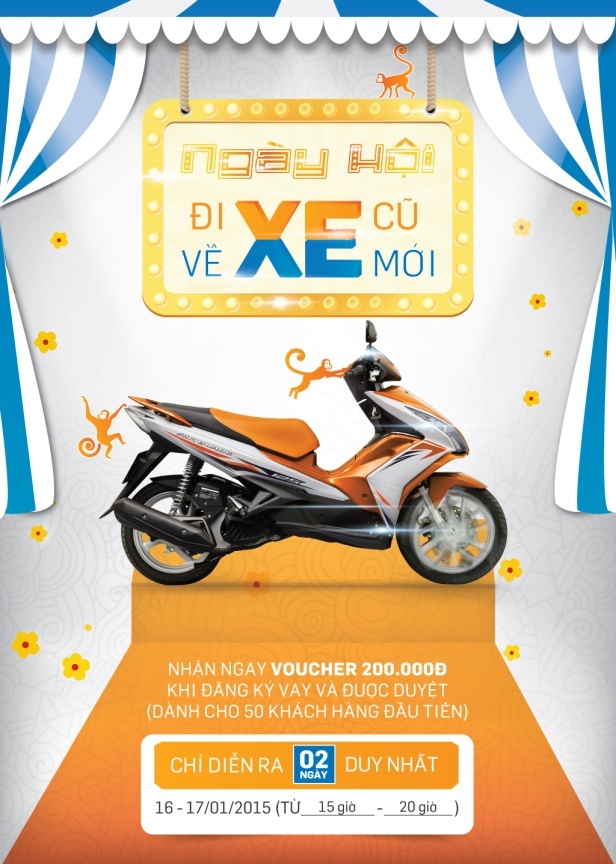 Đến với ngày hội này, khách hàng sẽ được hỗ trợ bán xe máy cũ và mua trả góp ngay xe mới với mức trả góp chỉ từ 300.000 đồng/tháng và trả trước bằng giá trị xe cũ. Đây là một sản phẩm cho vay mua xe máy trả góp hoàn toàn mới của FE Credit nhằm nâng cao giá trị tiện ích cho khách hàng.