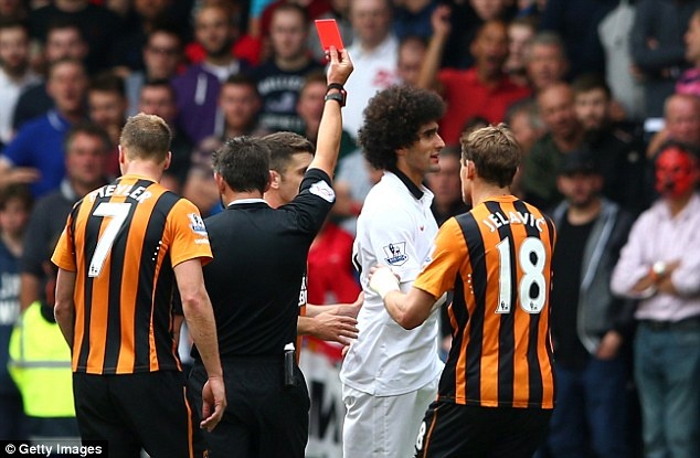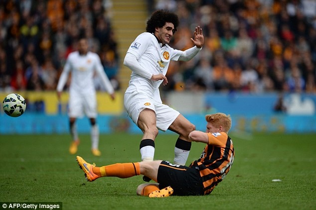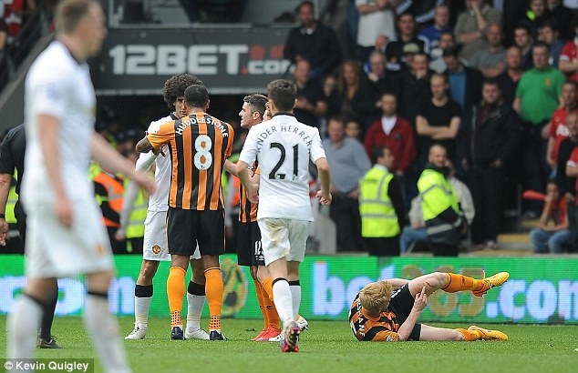 | Chưa đầy 18 phút sau khi vào sân thay Ashley Young, tiền vệ Marouane Fellaini vào bóng nguy hiểm với hậu vệ McShane của Hull City phút 76. |