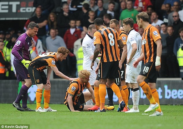 | Cầu thủ hai đội động viên McShanes sau pha phạm lỗi. |