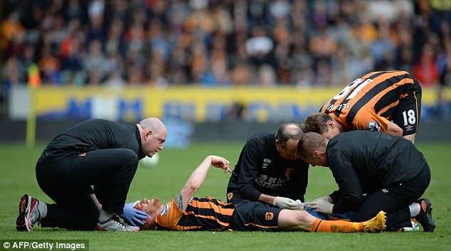 | Các bác sĩ khâu vết thương cho ngôi sao 29 tuổi ngay trên sân Kingston Communications. |