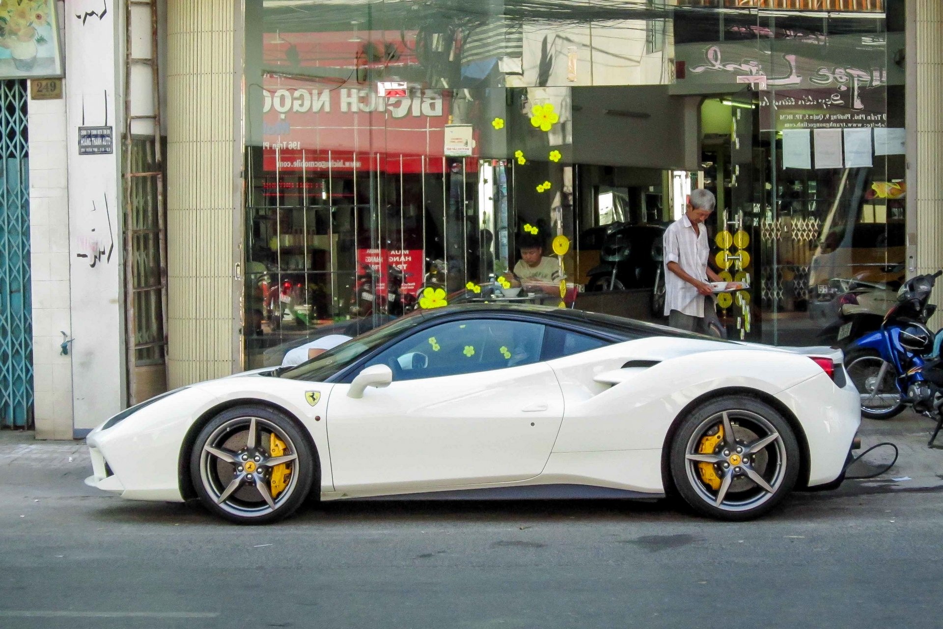 Siêu xe Ferrari 488 màu trắng nằm trong lô hàng 3 chiếc đầu tiên mới nhập về Việt Nam. Đây là dòng xe thứ 2 của Ferrari được trang bị động cơ tăng áp, có giá 242.000 USD tại Mỹ.
