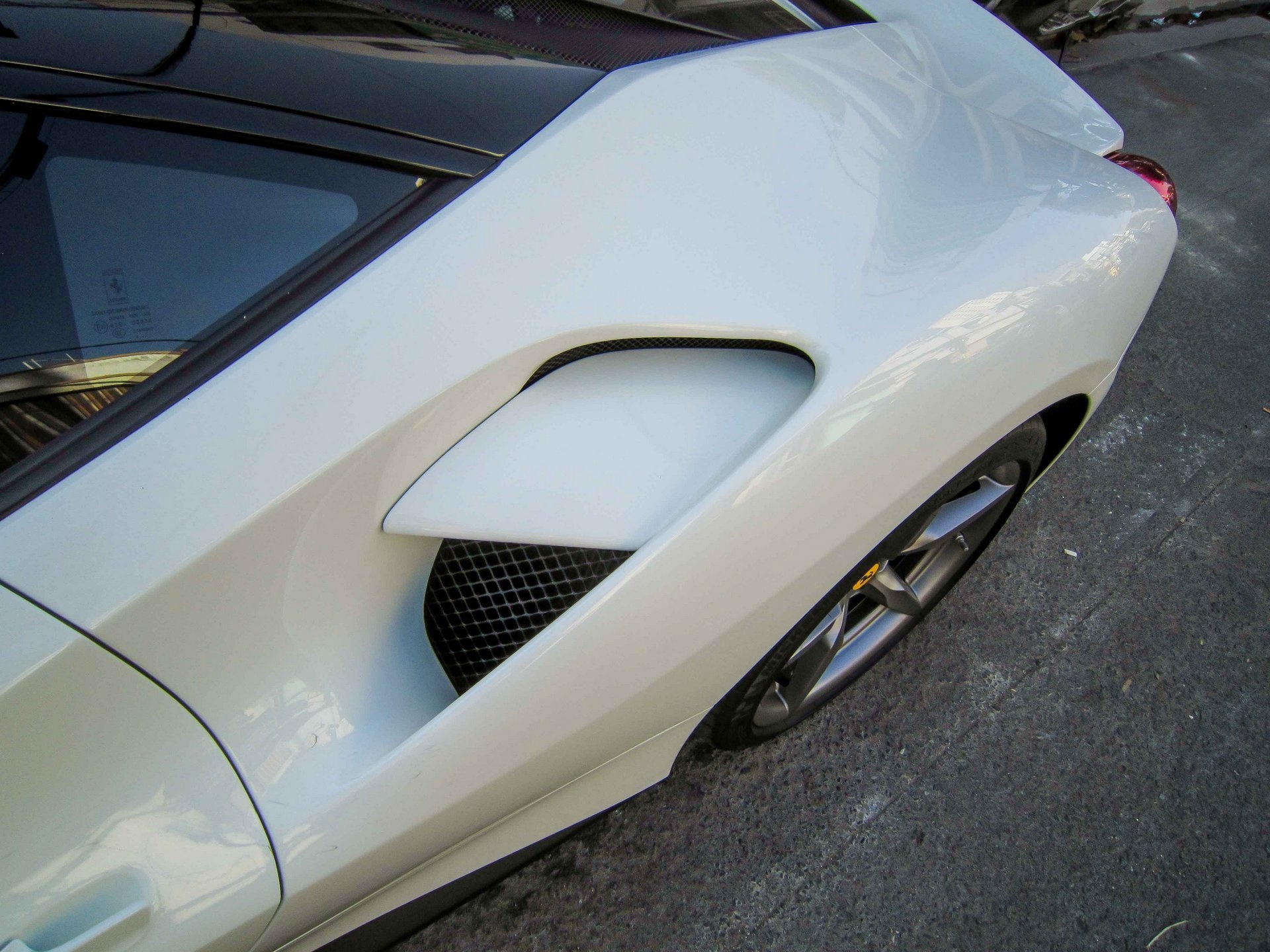 | Khe hút gió lớn được đặt hai bên hông. Các kỹ sư Ferrari còn đặt thêm cánh gió nhằm điều chỉnh luồng không khí đi qua. |
