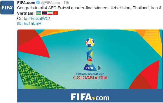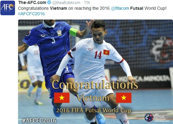 | AFC chúc mừng ĐT futsal Việt Nam trên trang Twitter. |