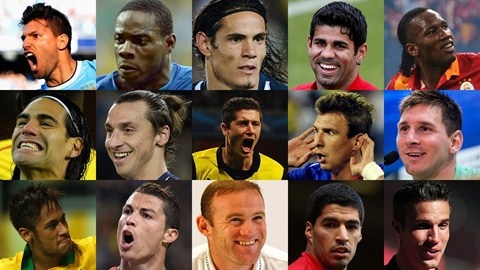 Sergio Aguero (Argentina, Manchester City); Mario Balotelli (Italy, Manchester City/AC Milan); Edinson Cavani (Uruguay, Napoli/PSG); Diego Costa (TBN, Atletico Madrid); Cristiano Ronaldo (BĐN, Real Madrid); Didier Drogba (Bờ Biển Ngà, Shanghai Shenhua/Galatasaray); Radamel Falcao (Colombia, Atletico Madrid/Monaco); Zlatan Ibrahimovi (Thụy Điển, PSG); Robert Lewandowski (Ba Lan, Borussia Dortmund); Mario Mandžukić (Croatia, Bayern Munich); Lionel Messi (Argentina, Barcelona); Neymar (Brazil, Santos FC/Barcelona); Wayne Rooney (Anh, Manchester United); Luis Suárez (Uruguay, Liverpool); Robin van Persie (Hà Lan, Manchester United).