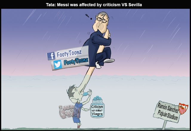 | Sau khi bị chỉ trích, Messi chơi khác hẳn trong trận gặp Sevilla, giúp HLV Tata Martino thoát khỏi cơn lũ ở SVĐ Ramon Sanchez Pizjuan. Ảnh: Footy Toonz. |