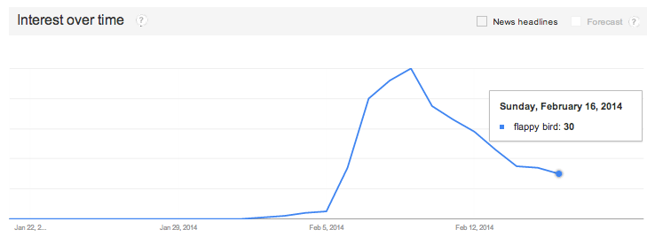 Theo kết quả mới công bố của Google thông qua dịch vụ tìm kiếm xu hướng (Google Trend), Flappy Bird là từ có xu hướng tìm kiếm nhiều nhất, đặc biệt nổi lên vào thời điểm từ ngày 5/2 đến 16/2 vừa qua.