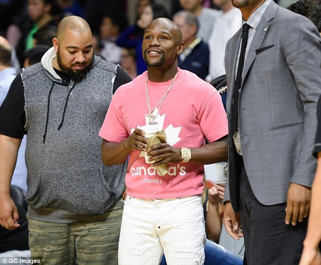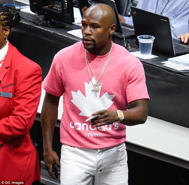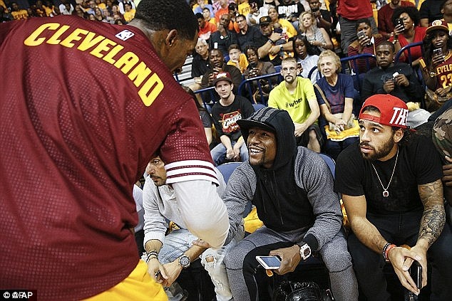 | Mayweather là fan cuồng nhiệt của bóng rổ. Mới đây anh cũng dành thời gian để dự khán trận đấu yêu thích giữa Atlanta Hawks và Cleveland Cavaliers. |