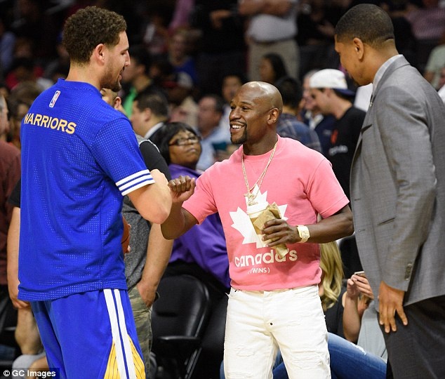 | Cựu võ sĩ sinh năm 1977 vừa dự khán trận bóng rổ giữa Golden State Warriors và LA Clippers tối 20/10 vừa qua. Trong ảnh, Mayweather chúc mừng ngôi sao Klay Thompson của đội Warriors. |