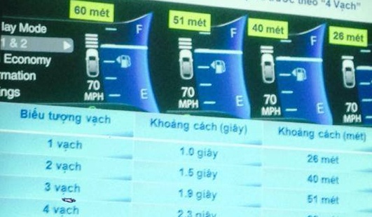 Người lái có thể lựa chọn khoảng cách với xe phía trước theo 4 vạch, tương ứng các khoảng cách 26, 40, 51 và 60 mét. Mỗi lần khởi động xe, hệ thống sẽ nhớ khoảng cách cài đặt cuối cùng. Chức năng này sử dụng sóng radar của hệ thống cảm biến để đo khoảng cách với xe phía trước. Khi hệ thống phát hiện khoảng cách không an toàn, hệ thống phanh ABS sẽ tự động tác động lực để giảm tốc độ và giúp xe duy trì khoảng cách an toàn.