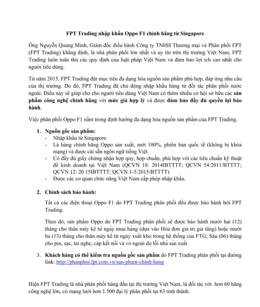 Cụ thể, trong văn bản gửi đến báo chí, ông Minh cho biết nguồn gốc lô hàng Oppo F1 là từ Singapore. Đây là hàng chính hãng Oppo sản xuất, mới 100%, phiên bản quốc tế (không bị khóa mạng) và được cài sẵn ngôn ngữ tiếng Việt.