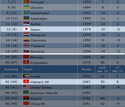 | Thứ tự của Việt Nam và Nhật Bản trên bảng xếp hạng futsal thế giới. |