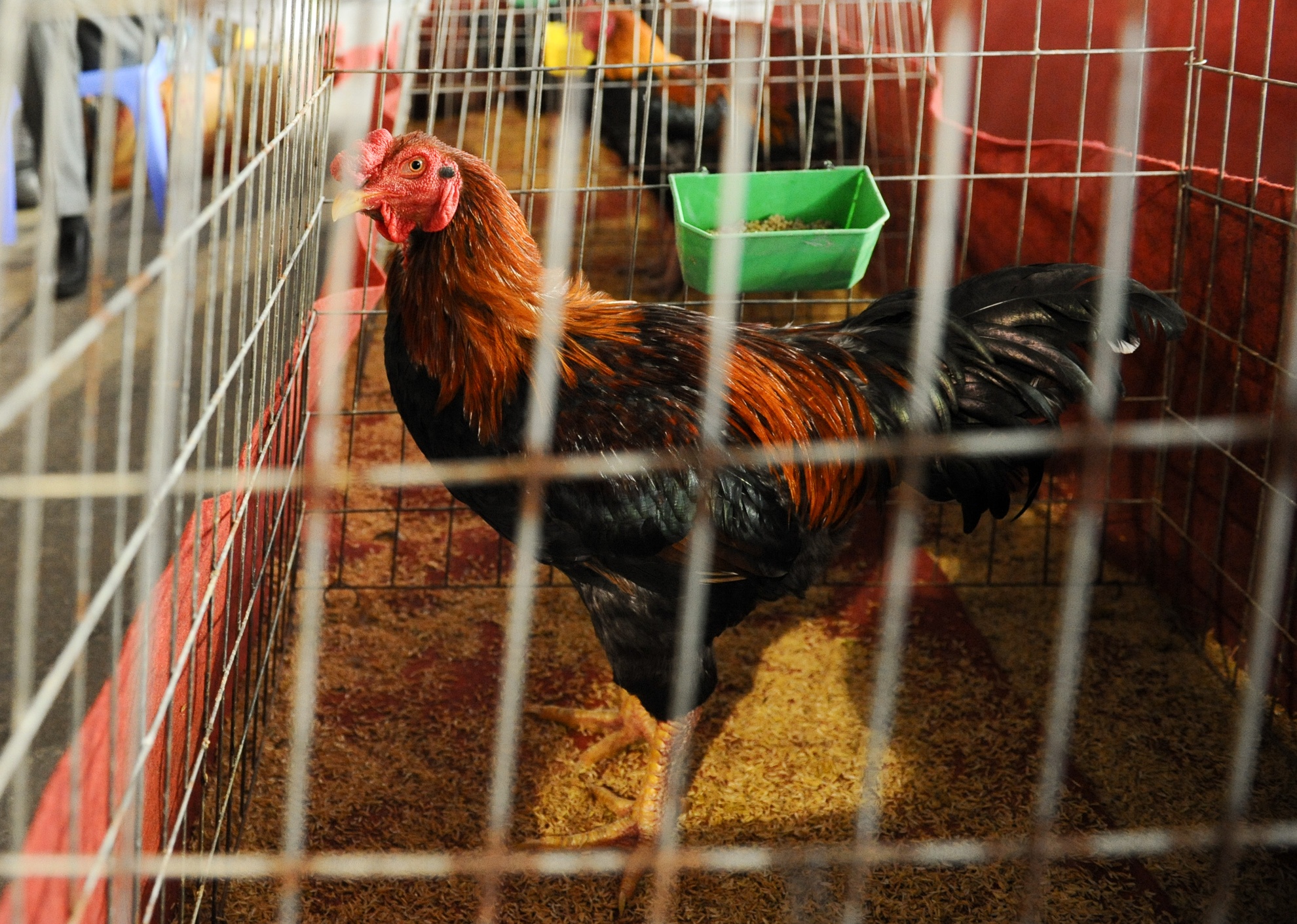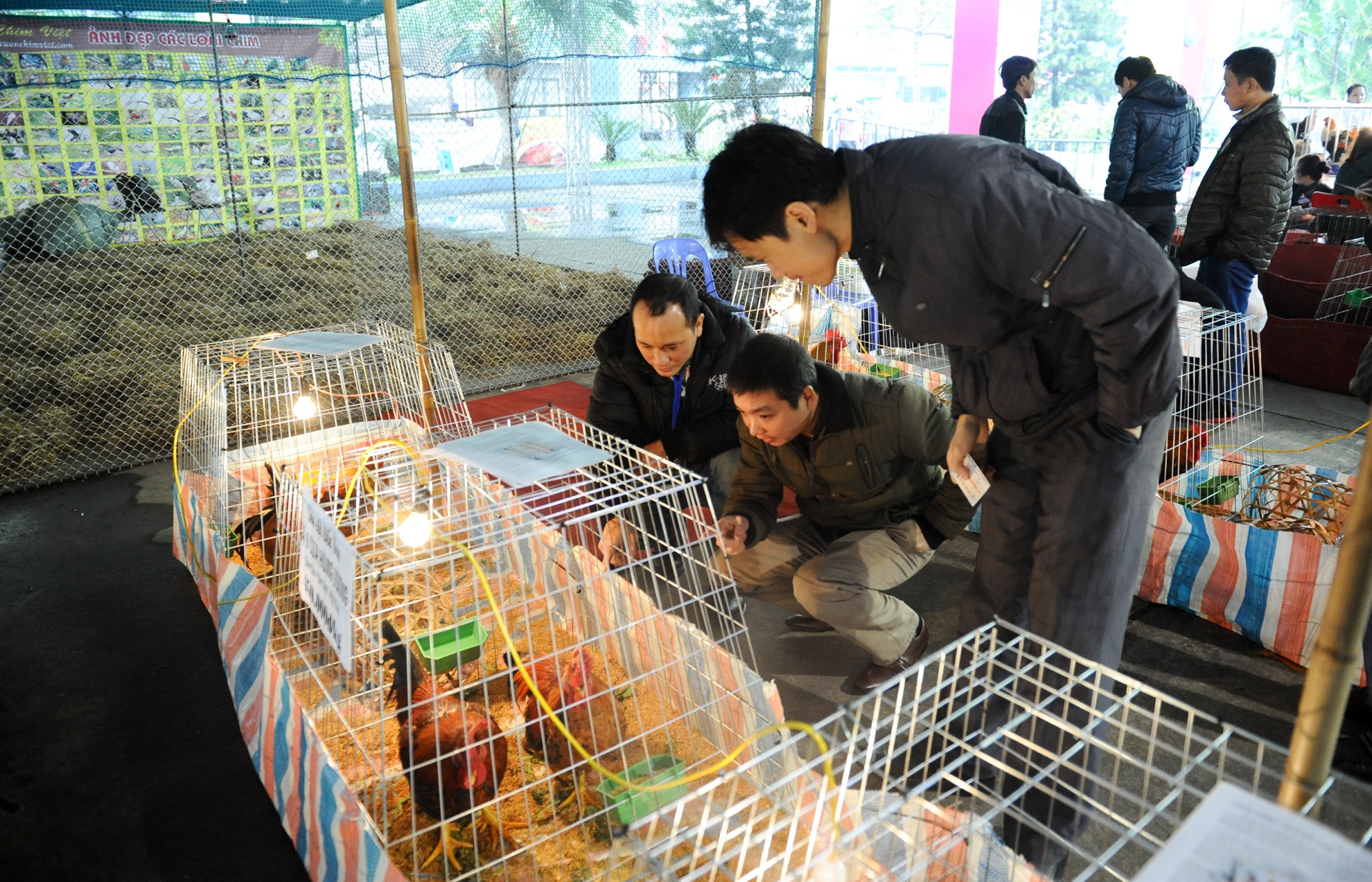 Gian hàng bày bán các loại gà đặc biệt thu hút sự chú ý của khách hàng trong khuôn khổ Hội chợ xuân tại triển lãm Giảng Võ, Hà Nội.