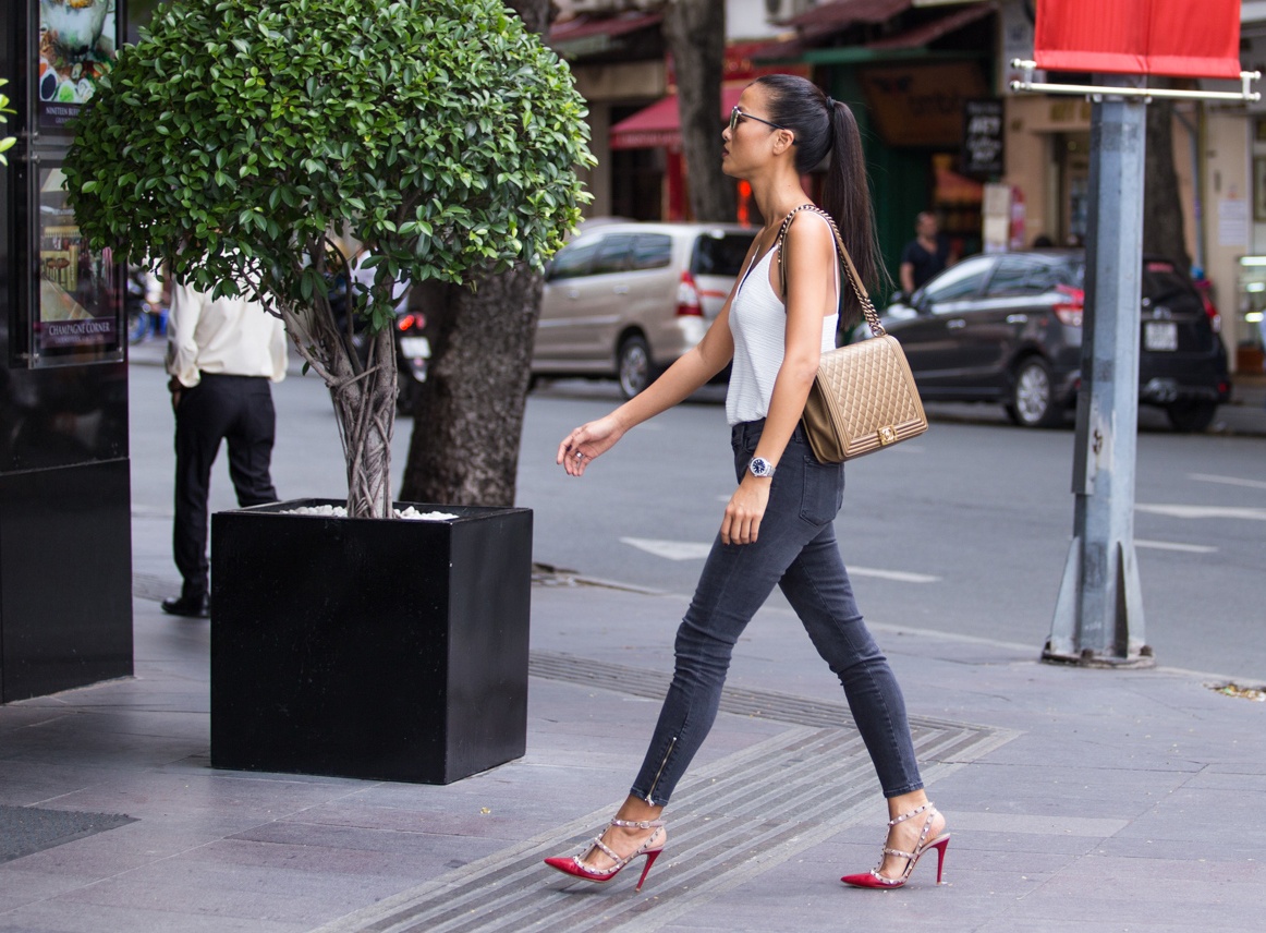 | Chiều 13/10, Bằng Lăng xuất hiện trên phố Sài thành khi đến điểm hẹn gặp gỡ bạn bè. Nữ người mẫu da nâu ăn vận phóng khoáng với mốt áo hai dây, quần jeans ôm sát, giày cao gót. |