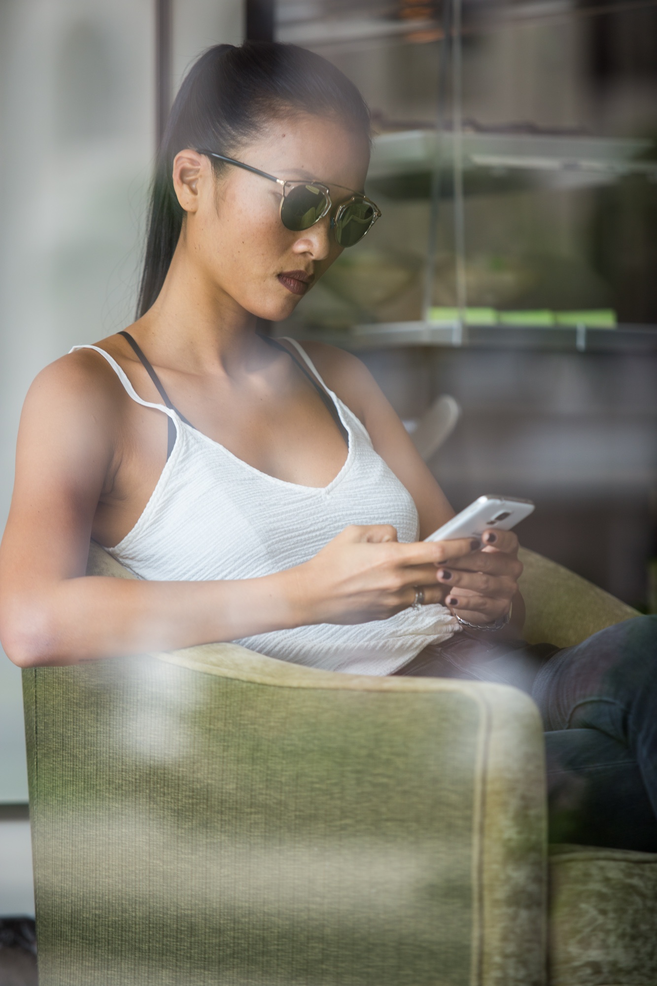 | Bà mẹ hai con lặng lẽ ngồi ở một góc quán cà phê sang trọng. |
