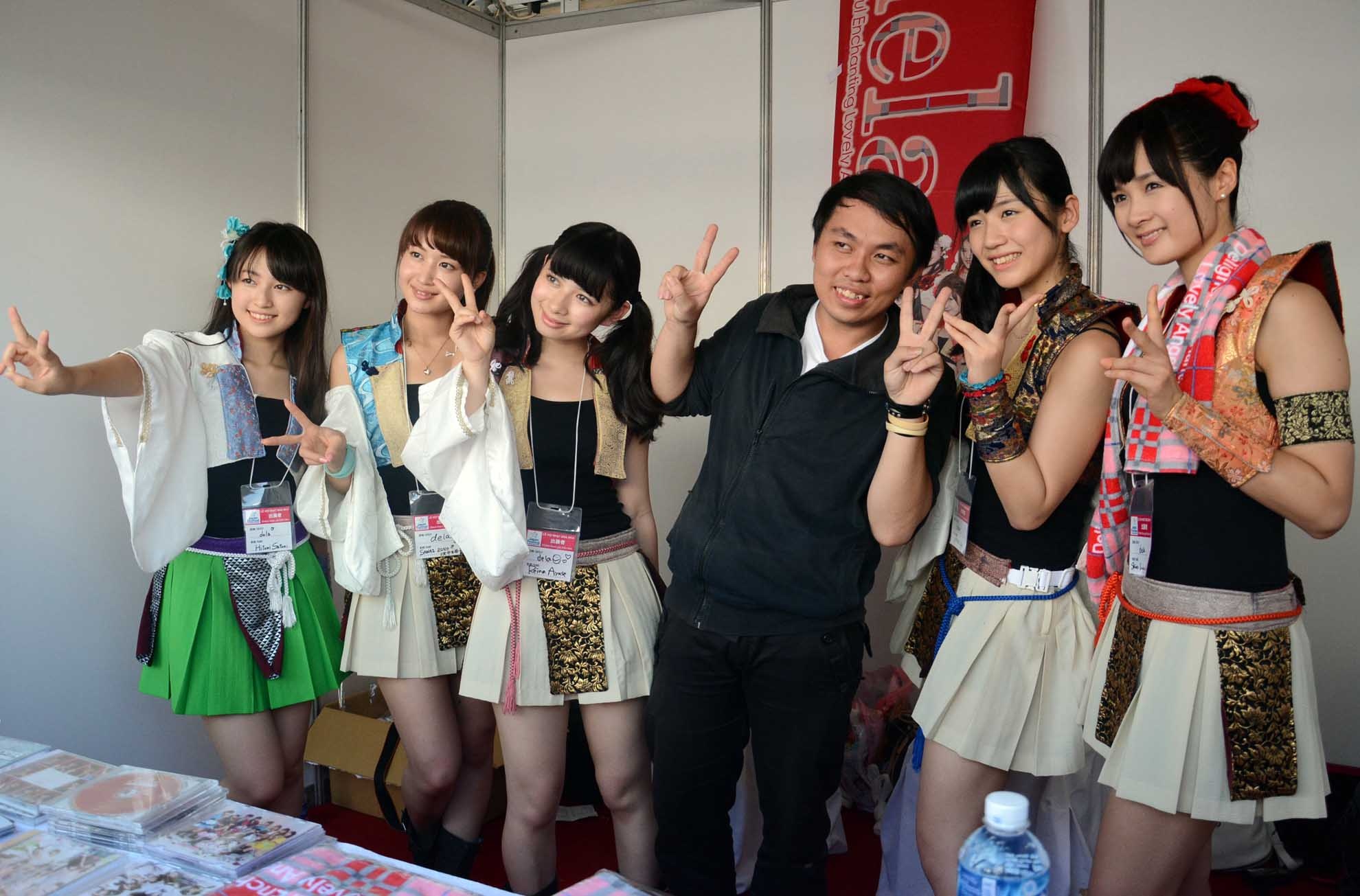 | Khách tham quan chụp hình cùng với các cô gái xinh đẹp của nhóm nhạc Thần tượng Dela đến từ Nhật. |