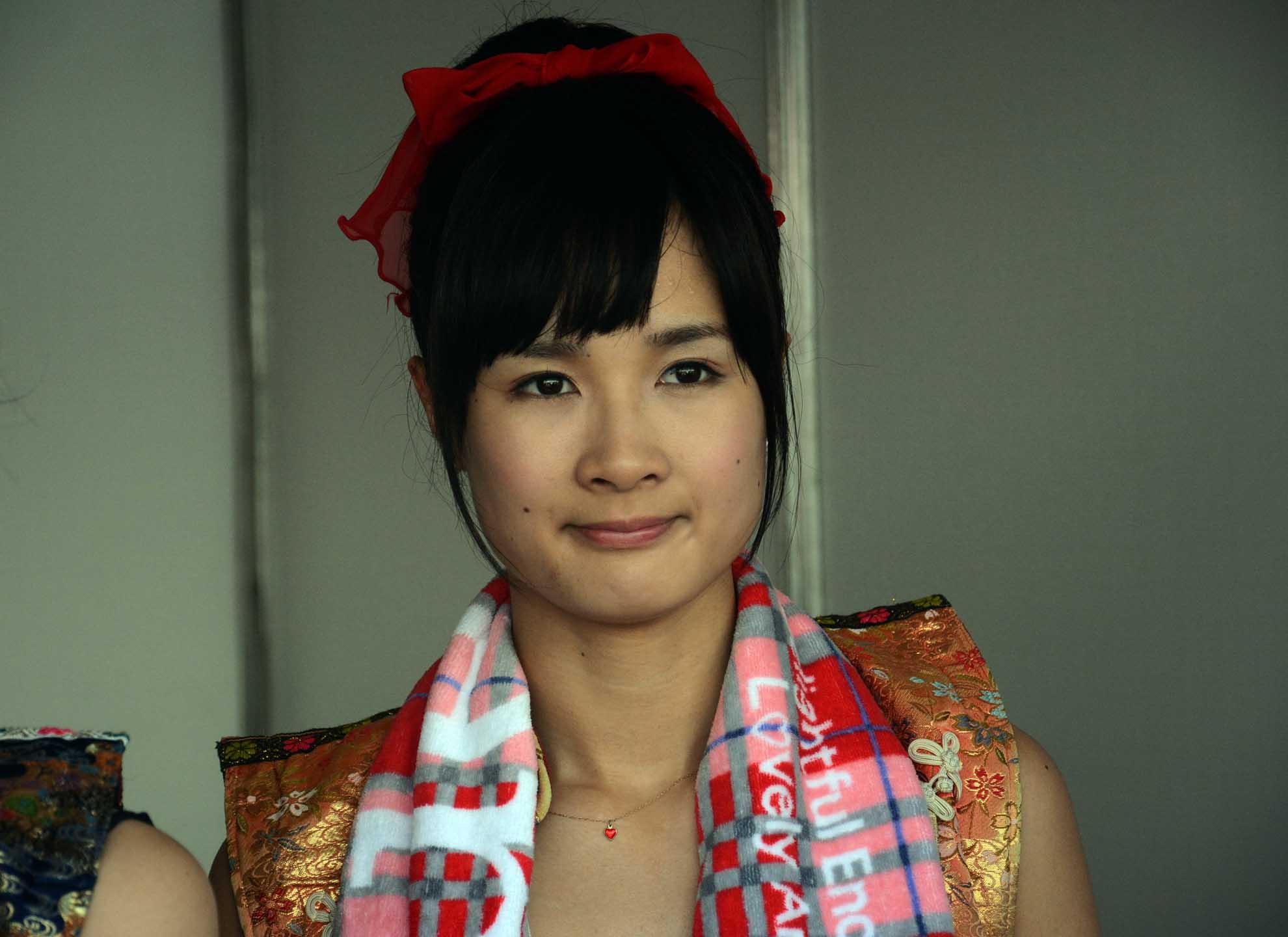 | Mặc dù đứng trong thời gian dài để giao lưu với khách tham gia lễ hội nhưng một thành viên xinh đẹp của nhóm nhạc Dela vẫn tươi cười rạng rỡ. |