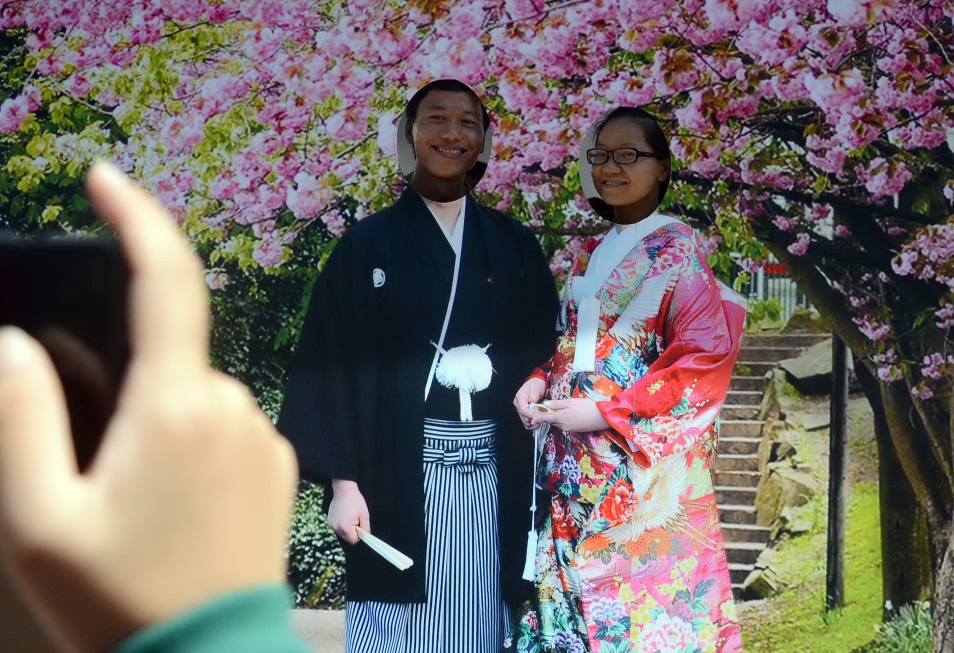 | Chụp hình lưu niệm với các cô gái mặc đồ kimono truyền thống của người Nhật. |