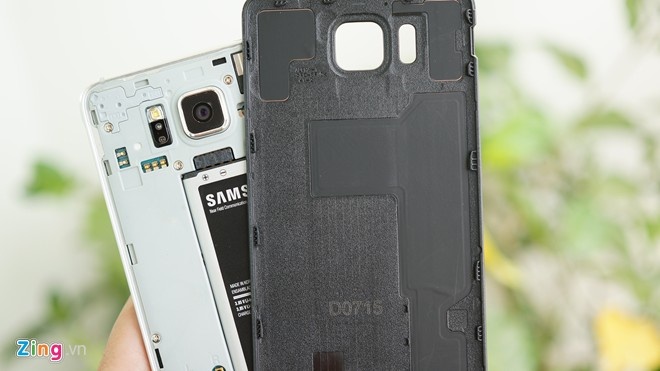 | Vỏ sau của Galaxy Alpha bằng nhựa, mỏng và không có các goăng caosu chống nước. |