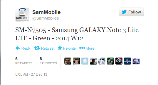 Nguồn tin từ SamMobile thân cận với Samsung cho biết, hãng điện thoại Hàn Quốc sẽ tung ra phiên bản giá rẻ của Galaxy Note 3 mang tên Galaxy Note Lite với tông màu xanh cốm. Tuy nhiên, thời điểm ra mắt Galaxy Note 3 giá rẻ vẫn còn khá xa. Theo dự kiến, chiếc smartphone sẽ được công bố sớm nhất vào tháng 3 năm sau.