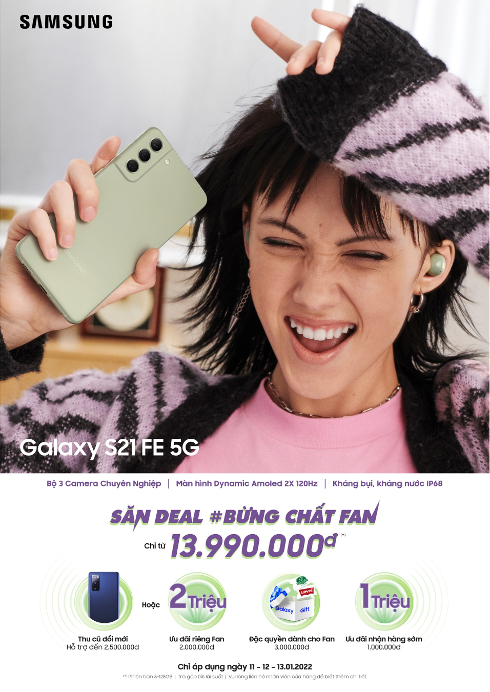 Samsung cũng lì xì đầu năm cho người dùng từ 11/1 đến 28/2 với ưu đãi 1 triệu đồng cho fan nhận hàng sớm, chương trình thu cũ đổi mới và gói ưu đãi đặc quyền cho người dùng Galaxy S21 FE. Độc giả xem chi tiết các chương trình tại đây.