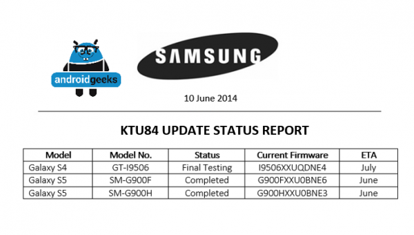 Tin đồn này bắt nguồn từ một tài liệu bị rò rỉ, theo đó hai phiên bản khác nhau của Galaxy S5 có tên mã lần lượt là SM-G900F (chạy chip Snapdragon) và SM-G900H (chạy chip Exynos) sẽ được cập nhật phiên bản mới nhất của Android trong tháng này. Các phiên bản quốc tế đã mở khóa sẽ nhận được bản cập nhật đầu tiên, sau đó là thị trường Mỹ, Canada và Mỹ Latinh.
