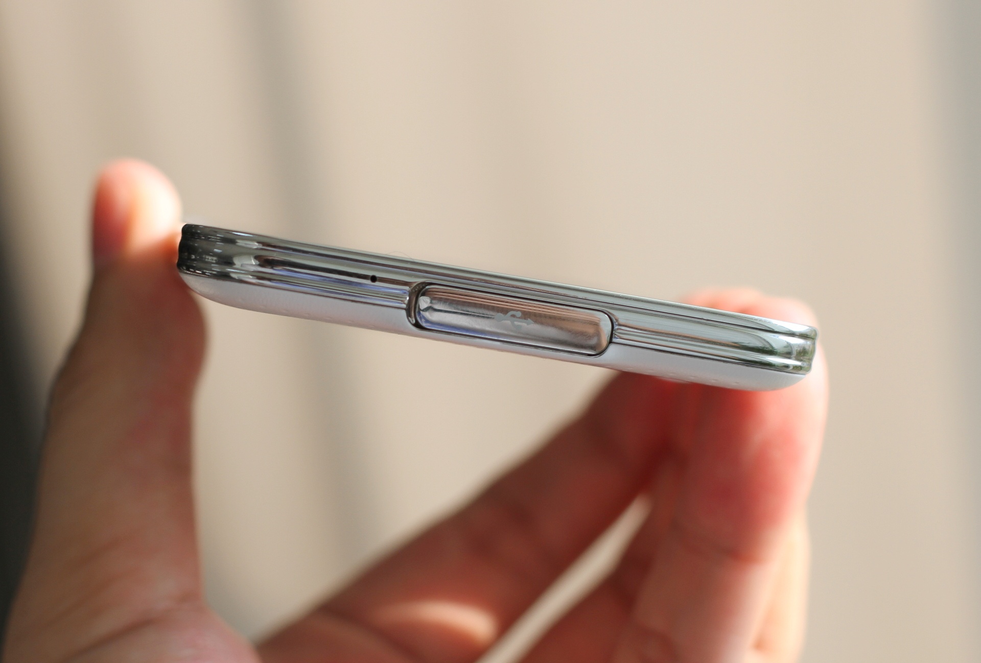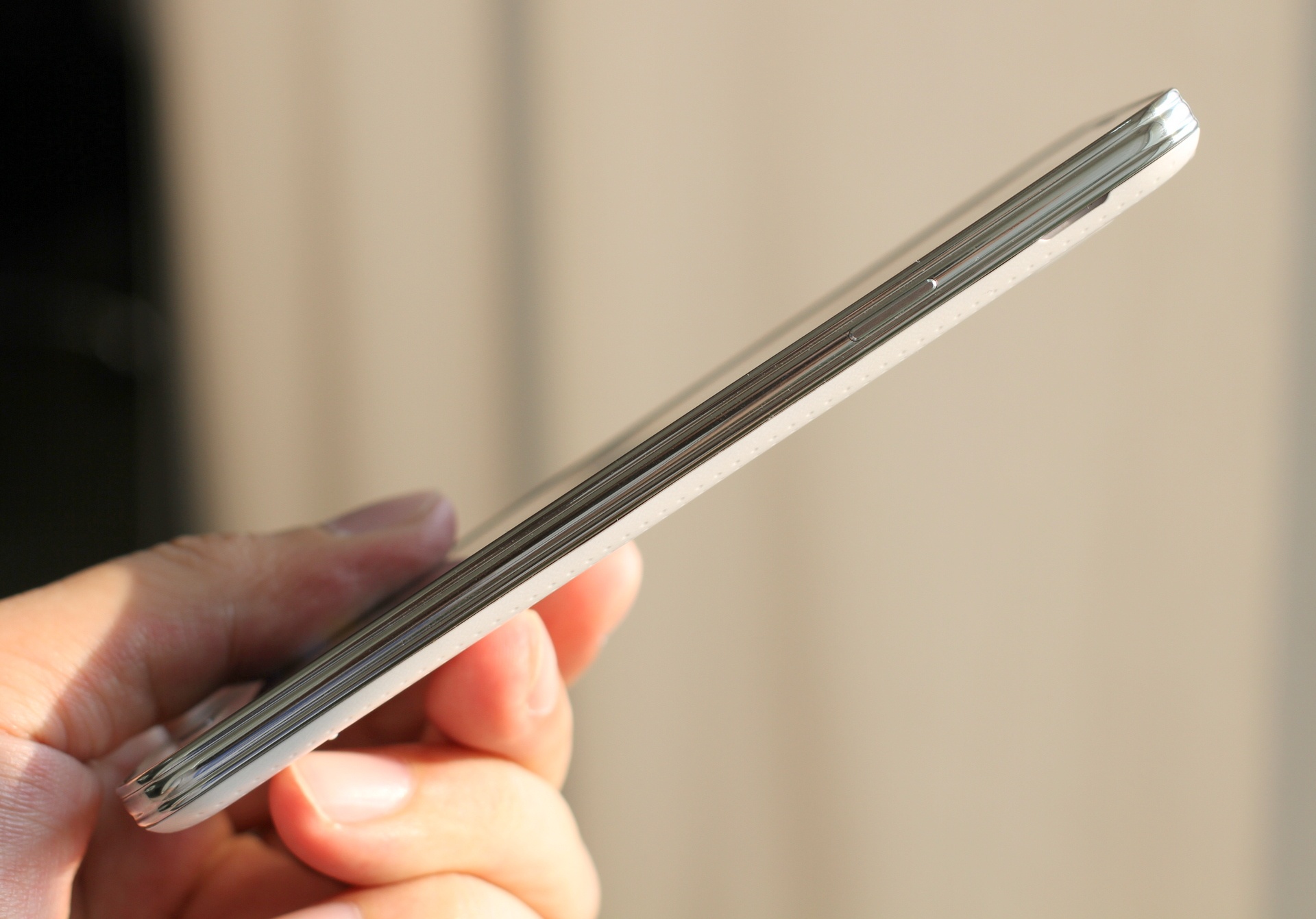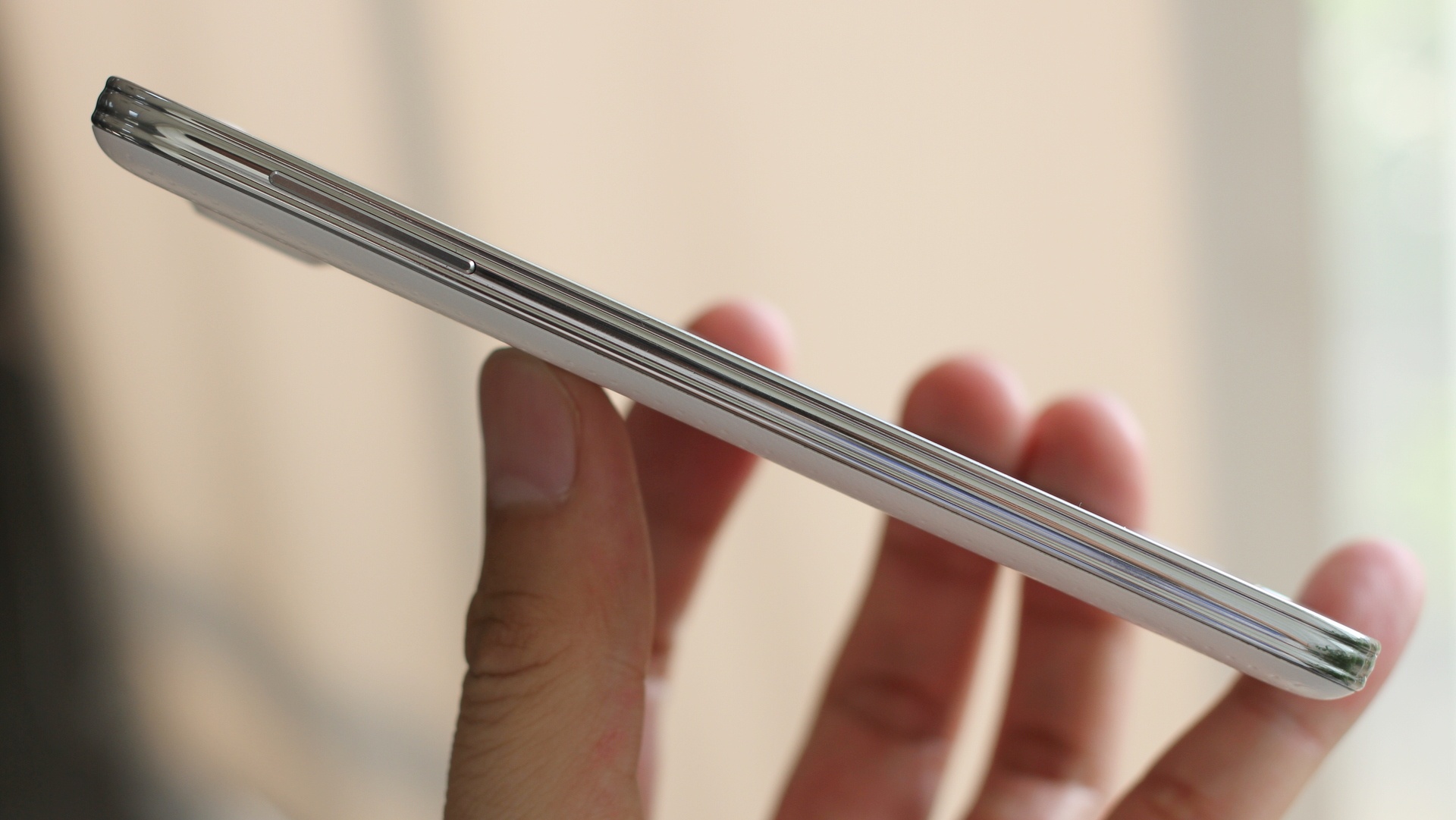 | Cạnh trái thiết bị. Hãng này sử dụng một đường viền mạ kim loại bao quanh với các đường chìm lớn hơn Note 3. |