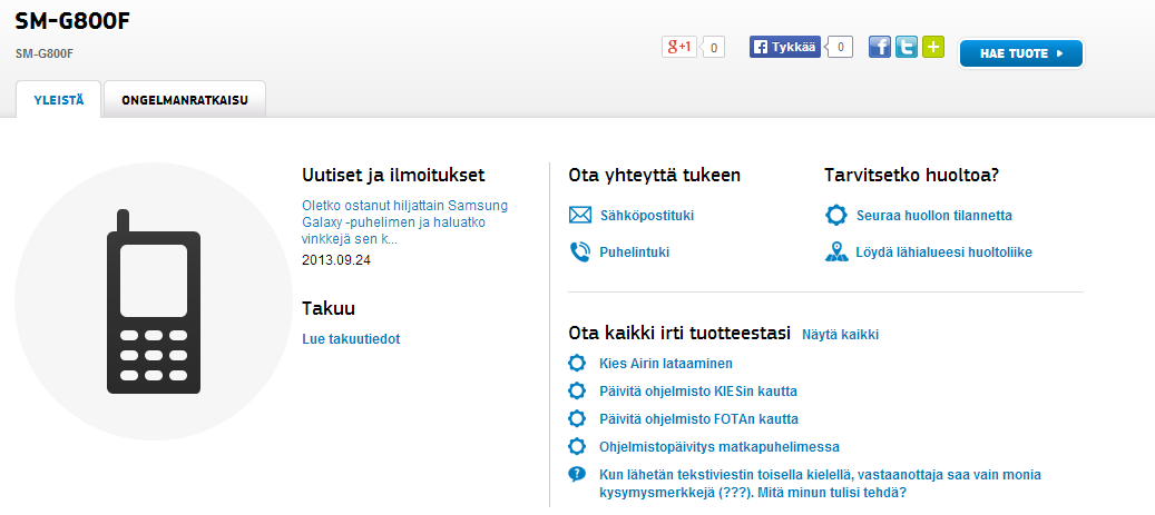 | Trang hỗ trợ Galaxy S5 mini trên trang web chính thức của Samsung Phần Lan. |