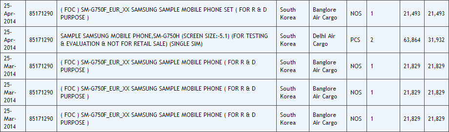 | Thông tin về dòng thiết bị có tên mã SM-G750 trên trang web Zauba của Ấn Độ. |